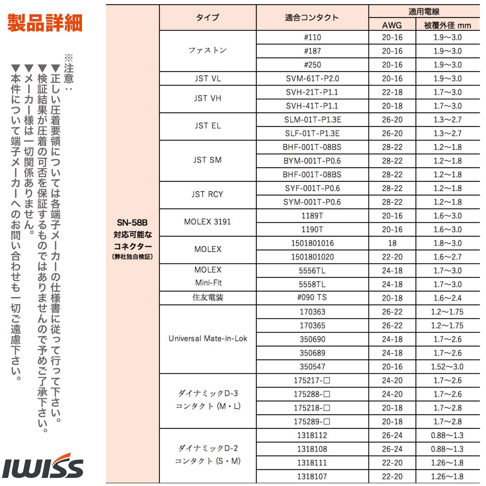用途:ファストン端子(#187・#250・#110)、Molex(モレックス) ニューミニフィット、ダイナミックコネクタなどを圧着。※エーモンギボシ端子用の商品ではございません!!国内のギボシ、肉厚の為、SNシリーズで対応しません。IWSまたはHSシリーズをご検討ください(IWS-0520B、HS-0520B等)。