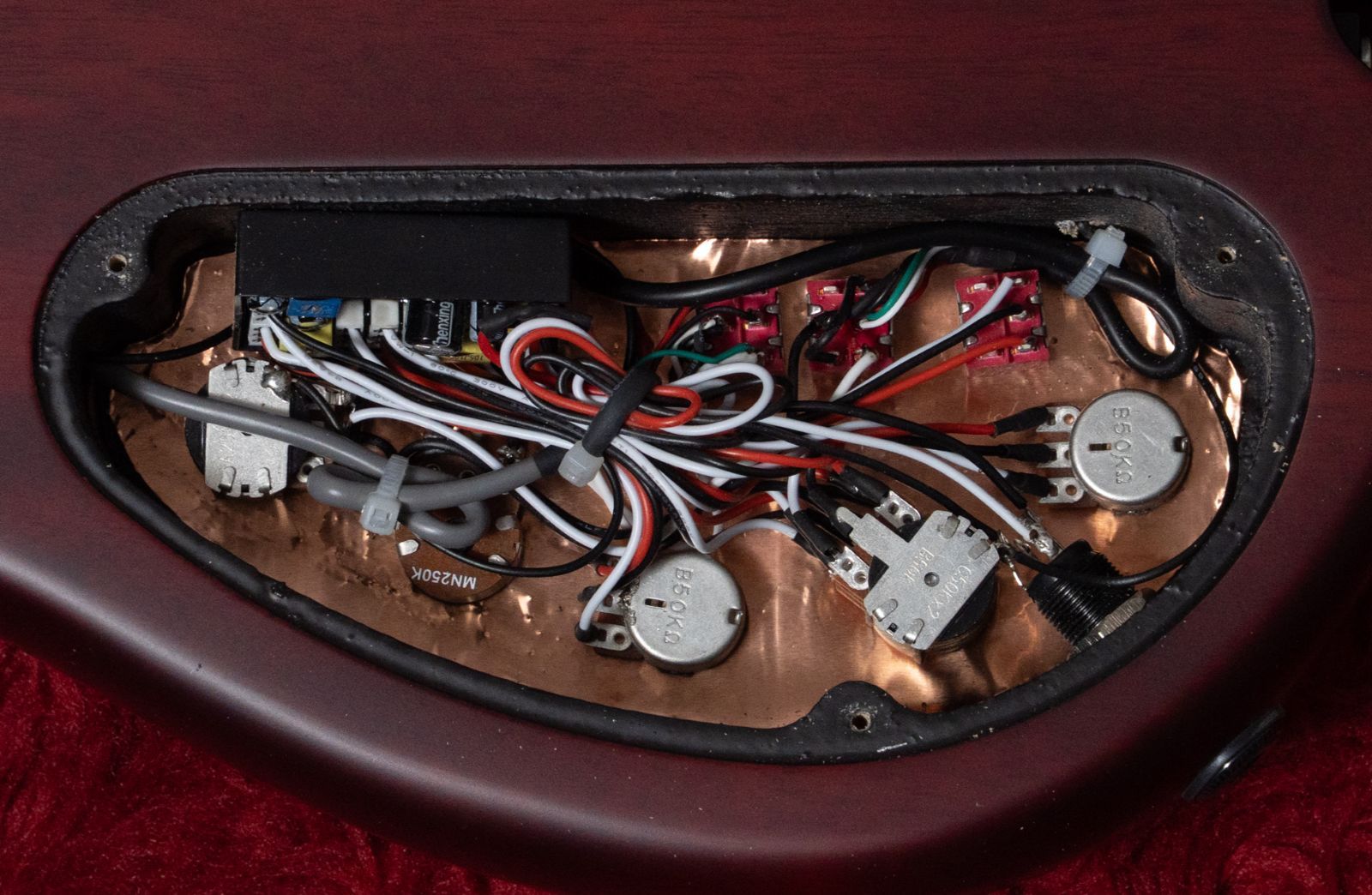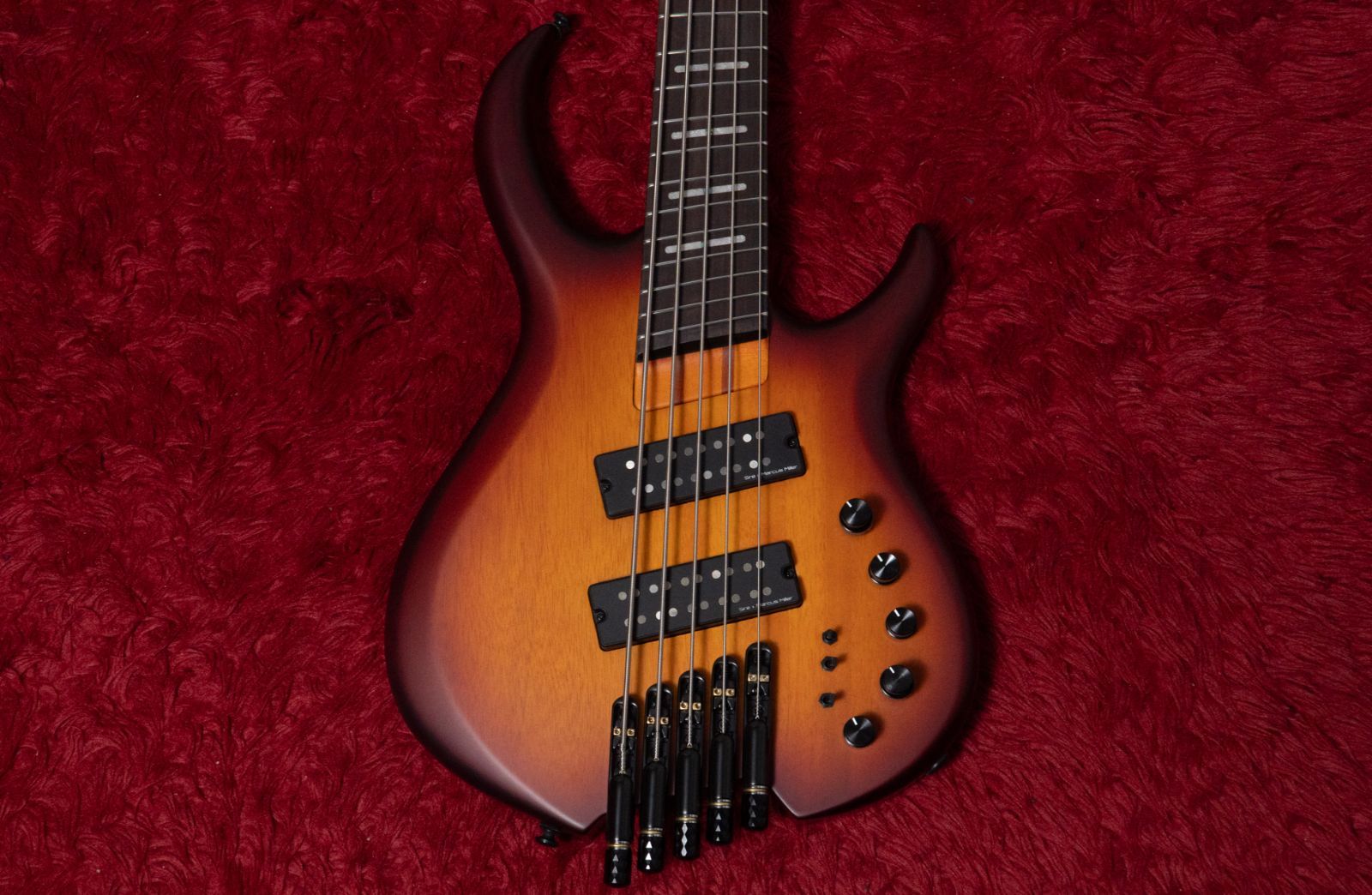 コントロールVolume/Tone (Dual Pot), Pickup Blender, Treble, Middle / Mid Frequency (Dual Pot), Bass, Mini Toggle (Active&Passive) 2 Mini Toggle (Pickup Series/Split/Parallel)と多様ですが、シンプルです。