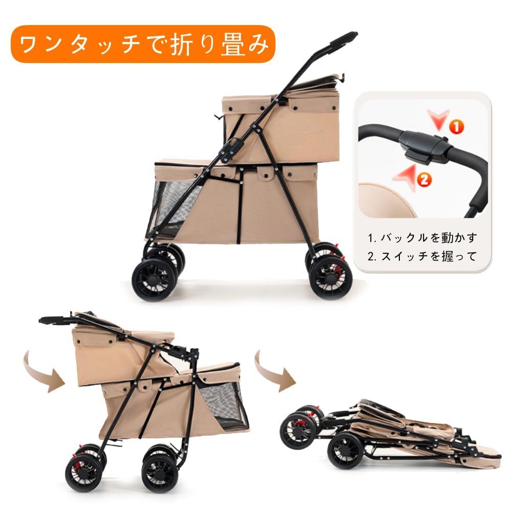 【折り畳み・便利性】本製品のフレームはワンタッチで折りたたむことができ、コンパクトに収納可能で、車のトランクにも収まります。公園、ショッピング、ペットカフェ、病院、旅行など、さまざまなシーンでの使用に適しており、車や電車などの交通手段での移動が便利です。