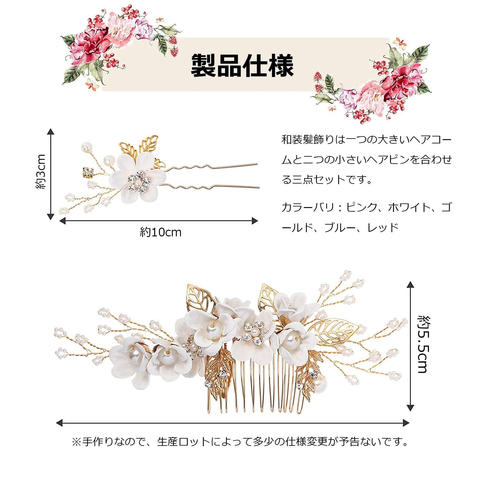【選べる5色♪魅力的な髪飾り】 ピンク、ホワイト、ゴールド、ブルー、レッドの合計5色のカラーをご用意しております。和装髪飾りは一つの大きいヘアコームと二つの小さいヘアピンを合わせる三点セットです。パールを散りばめた華やかなデザインとなっており、模造ダイヤモンド、ゴールドリーフと可愛い小花モチーフ、立体感溢れるゴージャスな仕上がりになります!ヘアスタイル、洋服の配色や使用シーンに合わせて、カラーを変えていただくと違った表情も楽しめます。お好みの色をぜひお試してください。