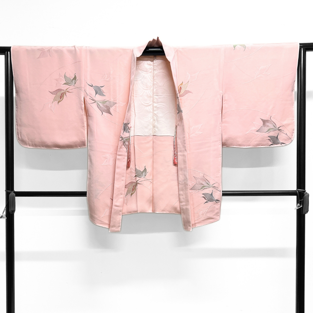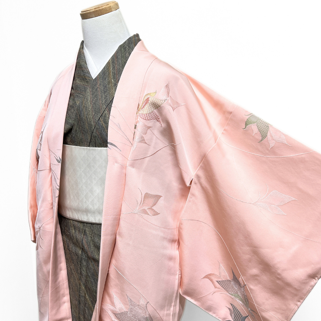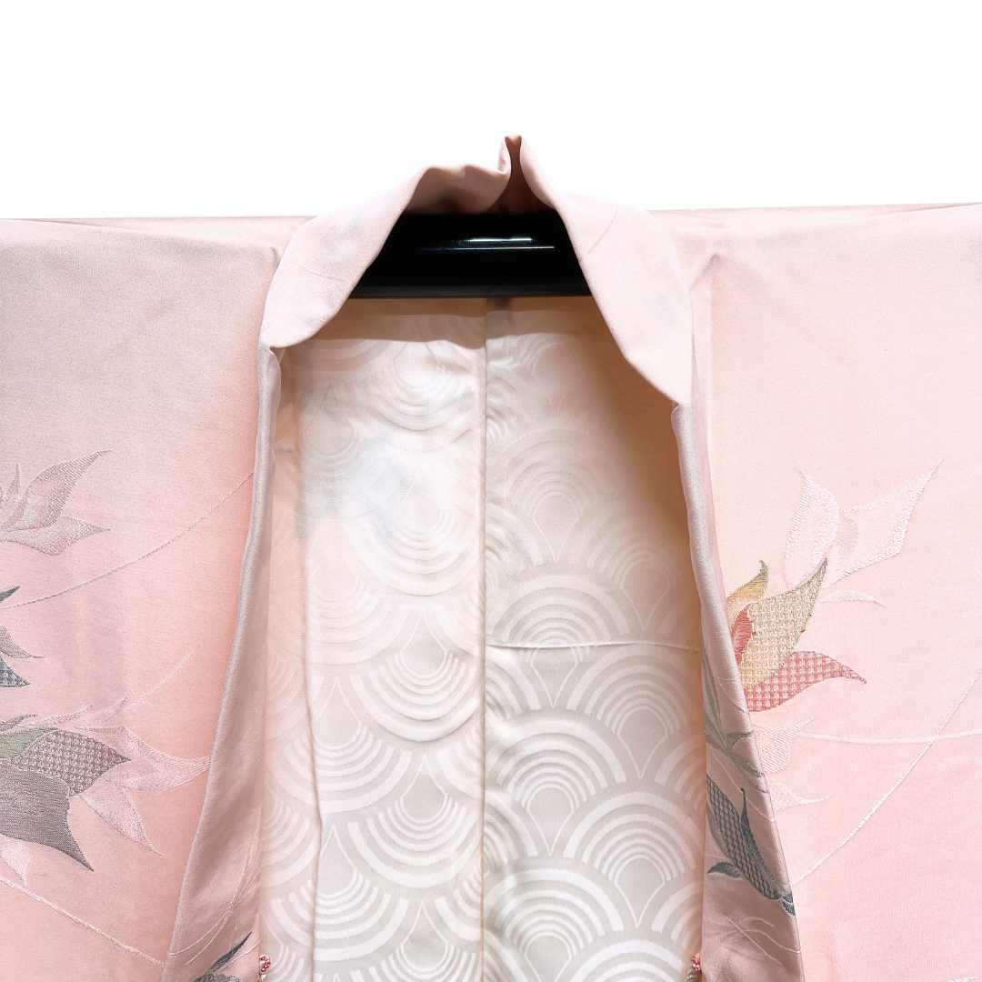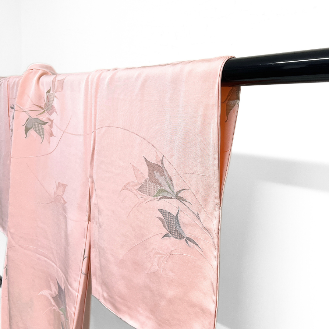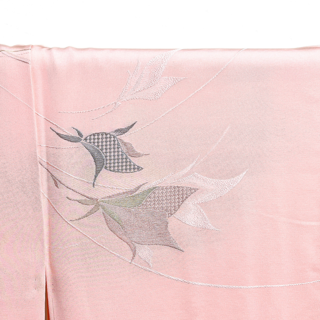 くすみのあるライトピンクの地に銀糸を交えて織られた花模様がお洒落なデザインの一着です。