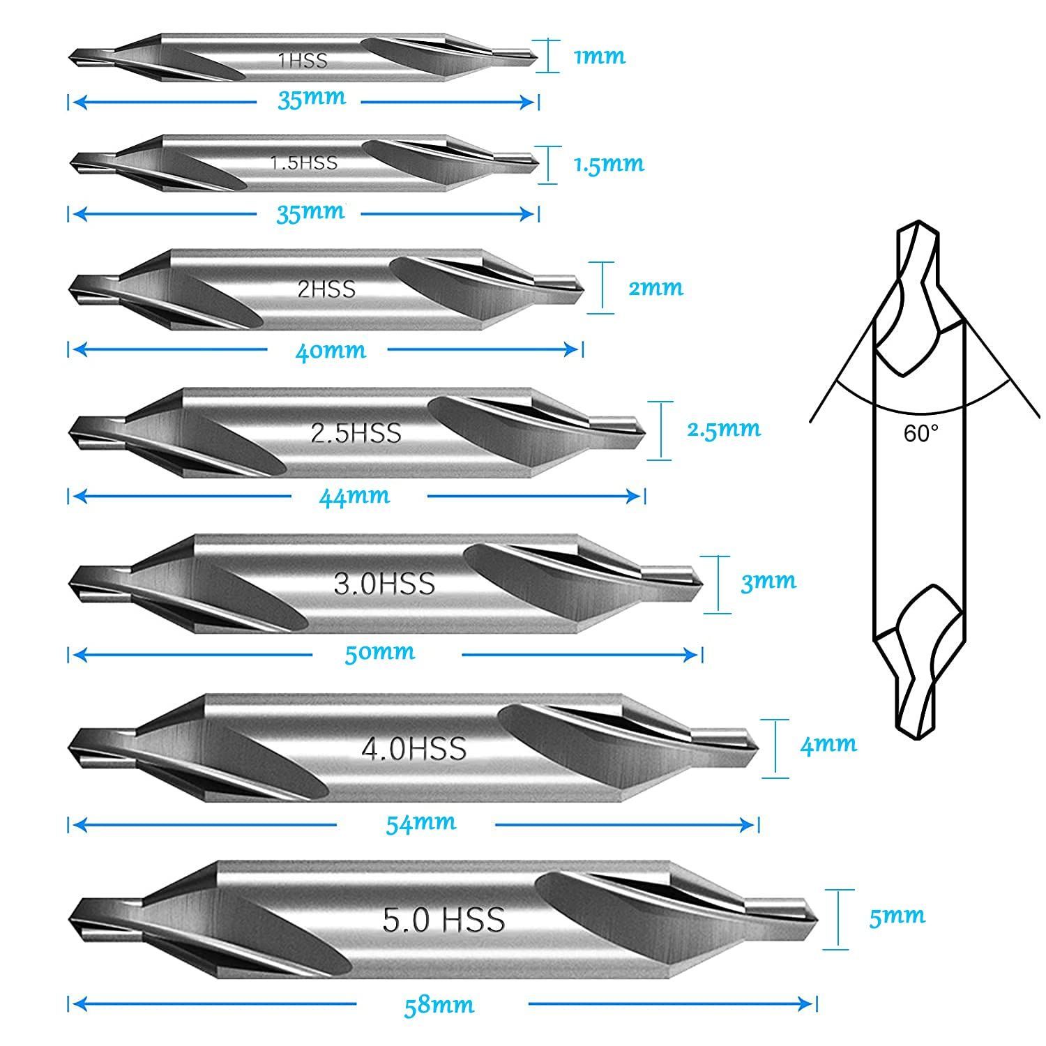 7本 センタードリルビット 60度の角度1mm/ 1.5mm / 2mm / 2.5mm / 3mm / 4mm/ 5mm 面取り ネジ穴 ツール 超硬 センタードリル 60° 金属加工/旋盤/木工に適応
