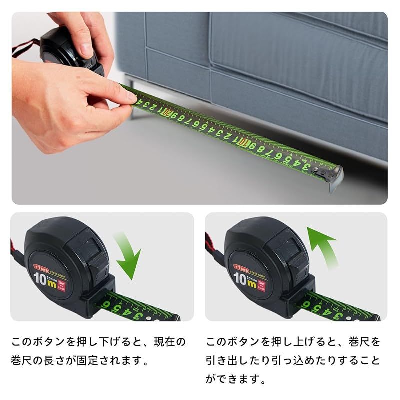 【利用者に優しい設計】所定の位置にテープをロックするボタンが付いている巻尺で、正確かつ信頼性の高い測定がいつでも可能です。テープのリリースはボタンを再度押すだけです。