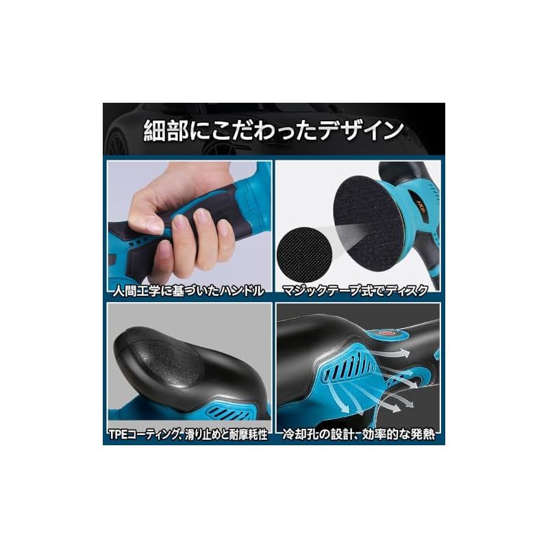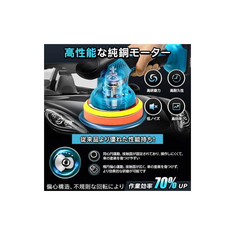 ▲【8段階変速可能★9mm偏心構造】IXP電動ポリッシャーには和式研磨バフが装備されており、日本車により適しています。PSE認証済みの製品ですので、安心してご使用ください。充電式ポリッシャーは従来の2段階変速製品に比べる8段階の変速にアップグレードされ、研磨シーンに応じて細かく変速できます。ポリッシャーの操作も簡単でスイッチを長押しすれば起動し、一回押すごとに速度が1段階上がります。作業内容に合わせて回転数は2800rpmから5500rpmの範囲で調整可能です。ポリッシャーは新しい偏心構造の回転方式を採用し、9mmの不規則な偏心軌道を使用することでより省力化、より広いポリッシング面積と強力なポリッシング力を提供します。傷のあるペイント面をカバーし、作業効率を大幅に向上させ、作業時間を短縮します。また、過熱の心配がないように、複数の放熱口も設計されています。(変速段階:1-3段階はワックスを軽く塗る。4-6段階は均一にワックスを塗る。7-8段階はワックスをしっかりと磨き込む)