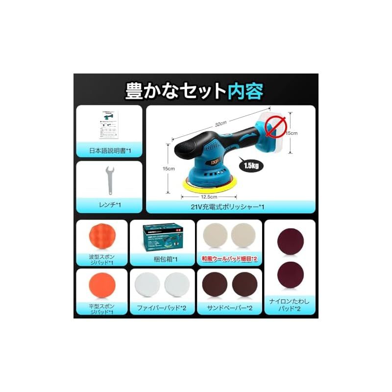 ▲【パッケージ内容★12ヶ月品質】セット内容:21V充電式ポリッシャー*1、和風ウールパッド細目*2、ナイロンたわしパッド*2、波型スボンジパッド*1、平型スポンジパッド*1、ウールパッド*2、サンドペーパー*2、日本語説明書*1。本体重量:1.5kg、サイズ:32*15*15cm。IXPポリッシャーは12ヶ月品質とアフターサービスを提供しております。ご質問があった場合、又は万が一商品に不具合が生じた場合があるなら、いつでもお気軽にお問い合わせください。必ず最善を尽くし、サービスを対応致します。
