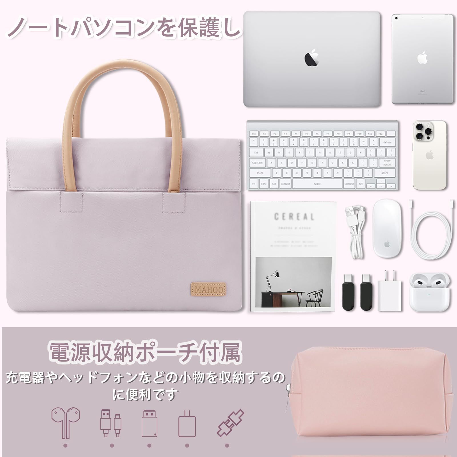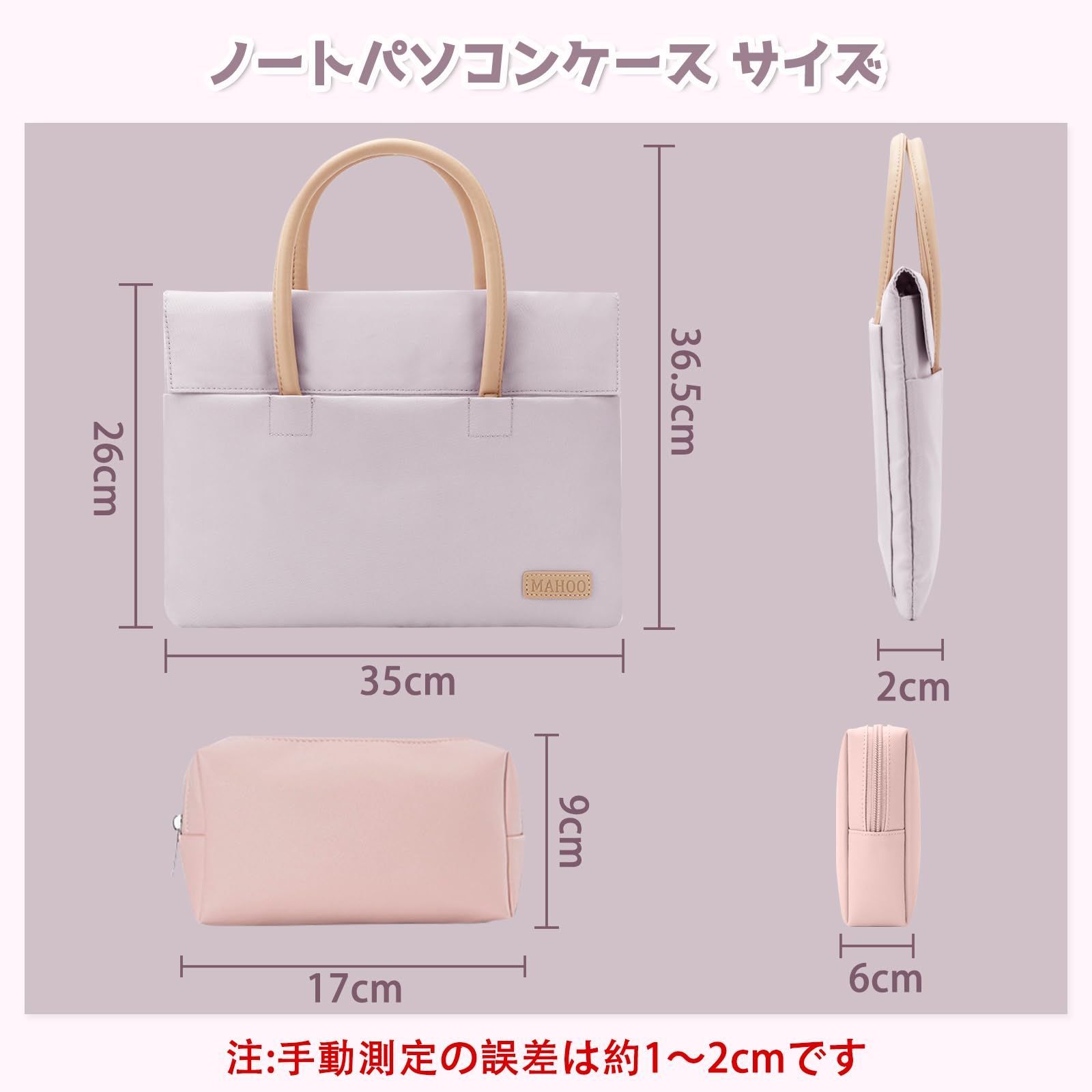 [互換性] LuFiYaノートパソコンケースは大部分の13.3/14 インチノートパソコンに対応します。ノートパソコンケースの外寸は35 cm*26 cm*2 cm、重量は260 g。電源収納ポーチの外寸は17 cm*9 cm*6 cm、重量は50 g。パソコンバッグ本体はラベンダー、電源バッグはピンクです。ご購入前にノートパソコンのサイズをご確認ください