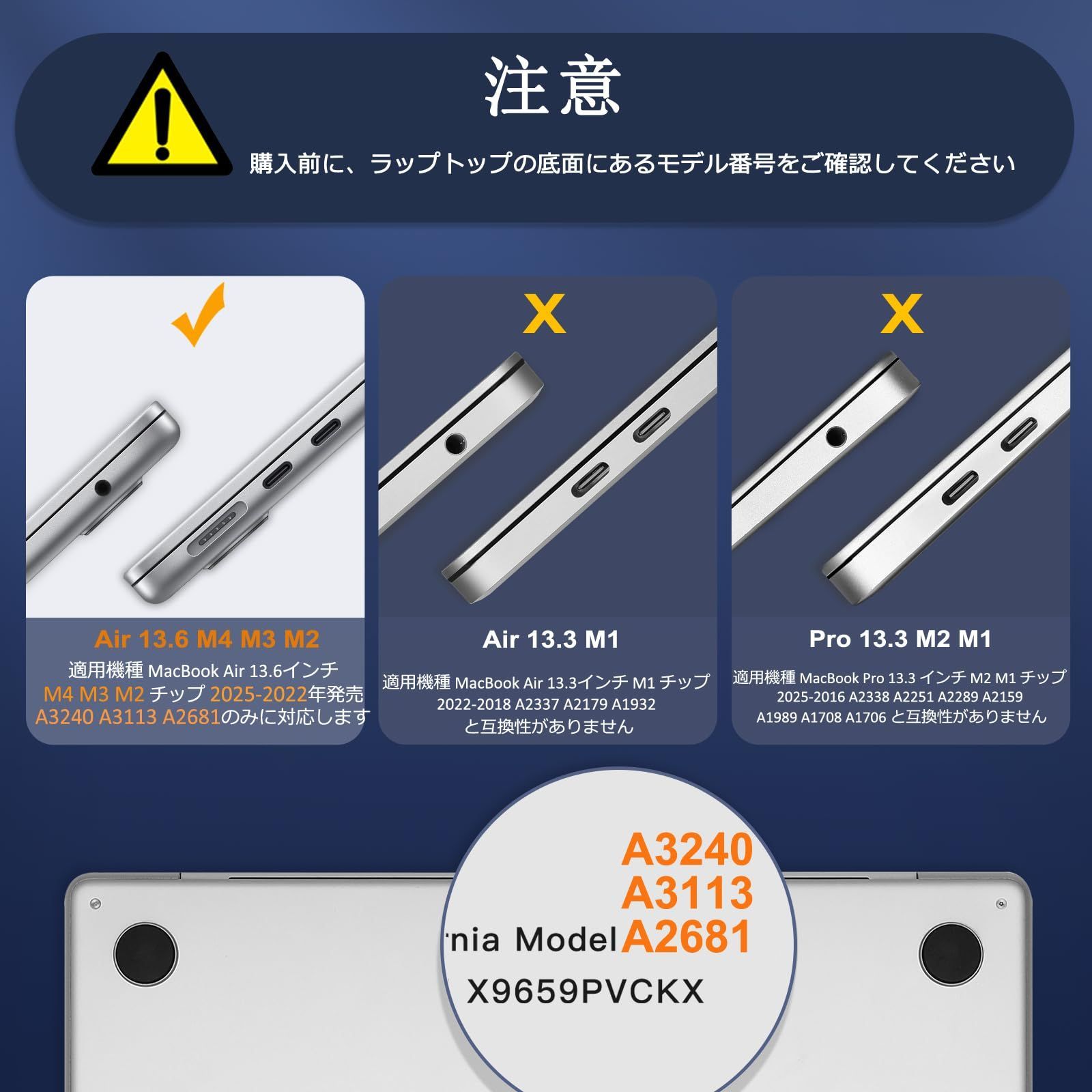 注意:購入前に、ラップトップの底面にあるモデル番号「Axxxx」をご確認してください。「A3240」、「A3113」、「A2681」と記載されているリストのタイトルとまったく同じモデル番号を選択してください。