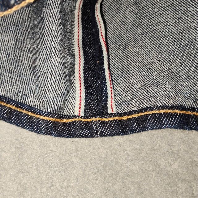 デニム生地には伝統的なシャトル織機で織り上げられた、赤耳セルビッジデニムを使用。