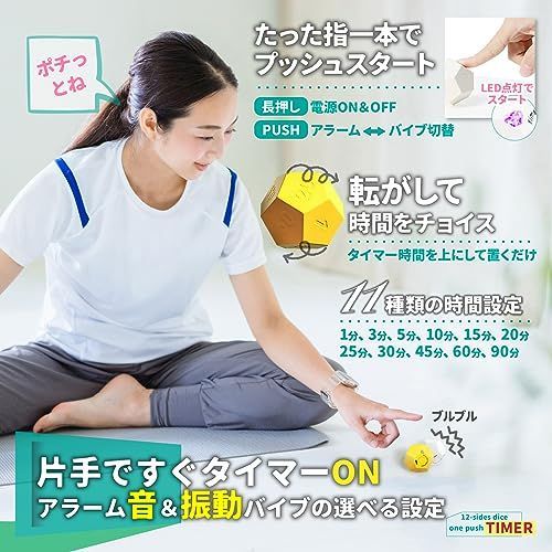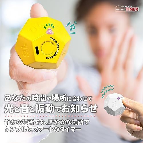 -◎-◎-◎-◎-◎-◎-◎-◎-◎-◎-◎-◎-◎-◎-◎- イエロー 12面体タイマーは、時間設定にボタンを連打する手間いらず。設定したい時間を上向きにするだけで、カウントダウン開始。1*90分まで11種類の時間設定が可能。選べるアラーム、バイブ、かわいいコンパクトサイズで携帯、持ち運び楽々。