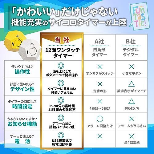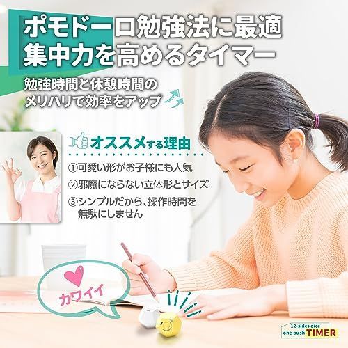 サイコロタイマーは、充電式、電池容量は450mAhでバッテリー長持ち。時間設定は12面体を回転させるだけ。ボタンを押すのが苦手な小さなお子様、高齢者でも操作は楽々。テスト、受験対策、勉強、調理やポモロードタイマー。