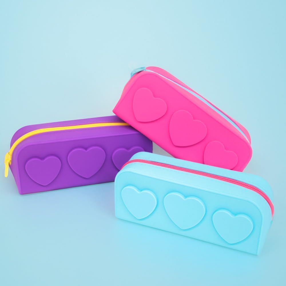 立体的なハートと鮮やかなバイカラーが可愛いペンケース。シリコンタイプでやわらかく、口が大きく開くので出し入れしやすいです。水や汚れが付いても拭き取ることができます。(完全防水ではありません)たっぷり収納できるので文房具をたくさん持ち運ぶことができます。筆箱としてだけでなく、メイクポーチやガジェットケースなどとしてもお使いいただけます。