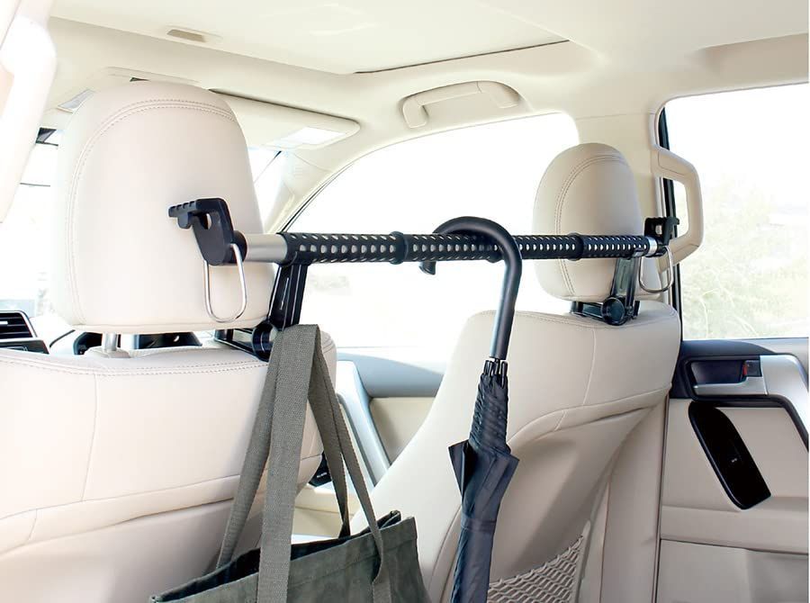 バーをヘッドレストのポールに取り付けられます。釣竿を乗せたり、ハンガーをかけたり、いろいろな使い方ができます。