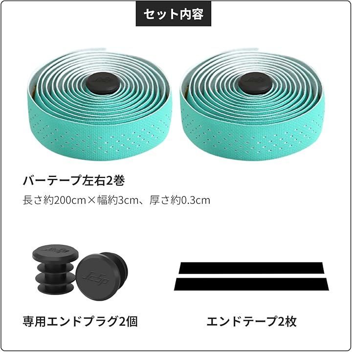 バーテープ左右2巻(長さ約200cmx幅約3cm、厚さ約0.3cm)、専用エンドプラグ2個、エンドテープ2枚が含まれます。