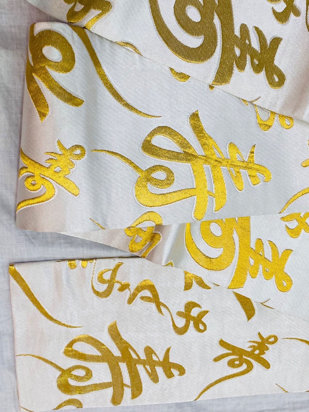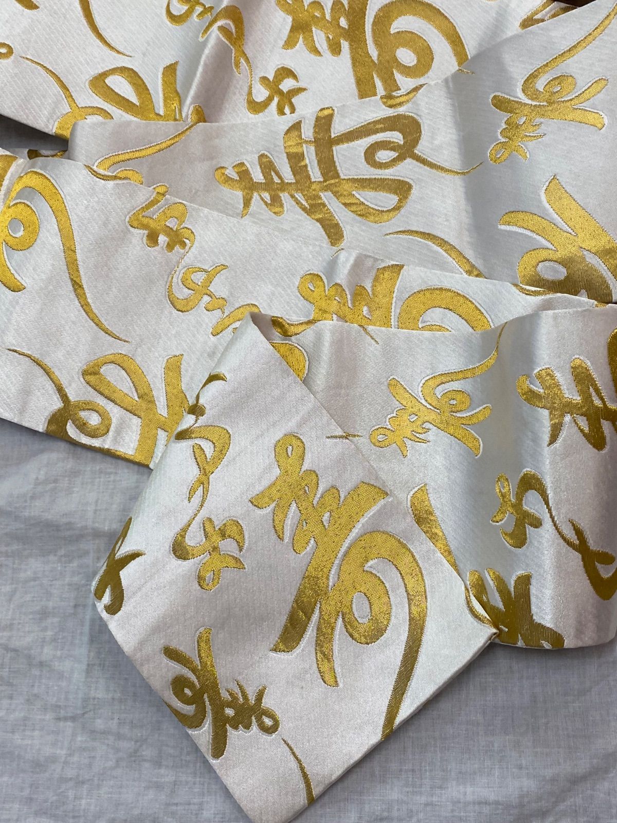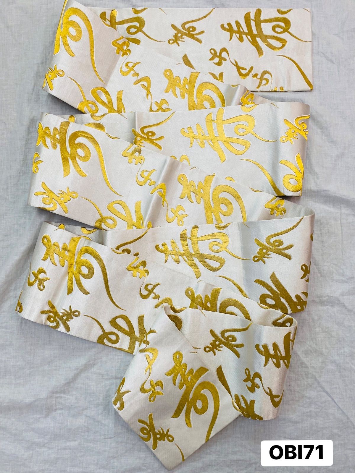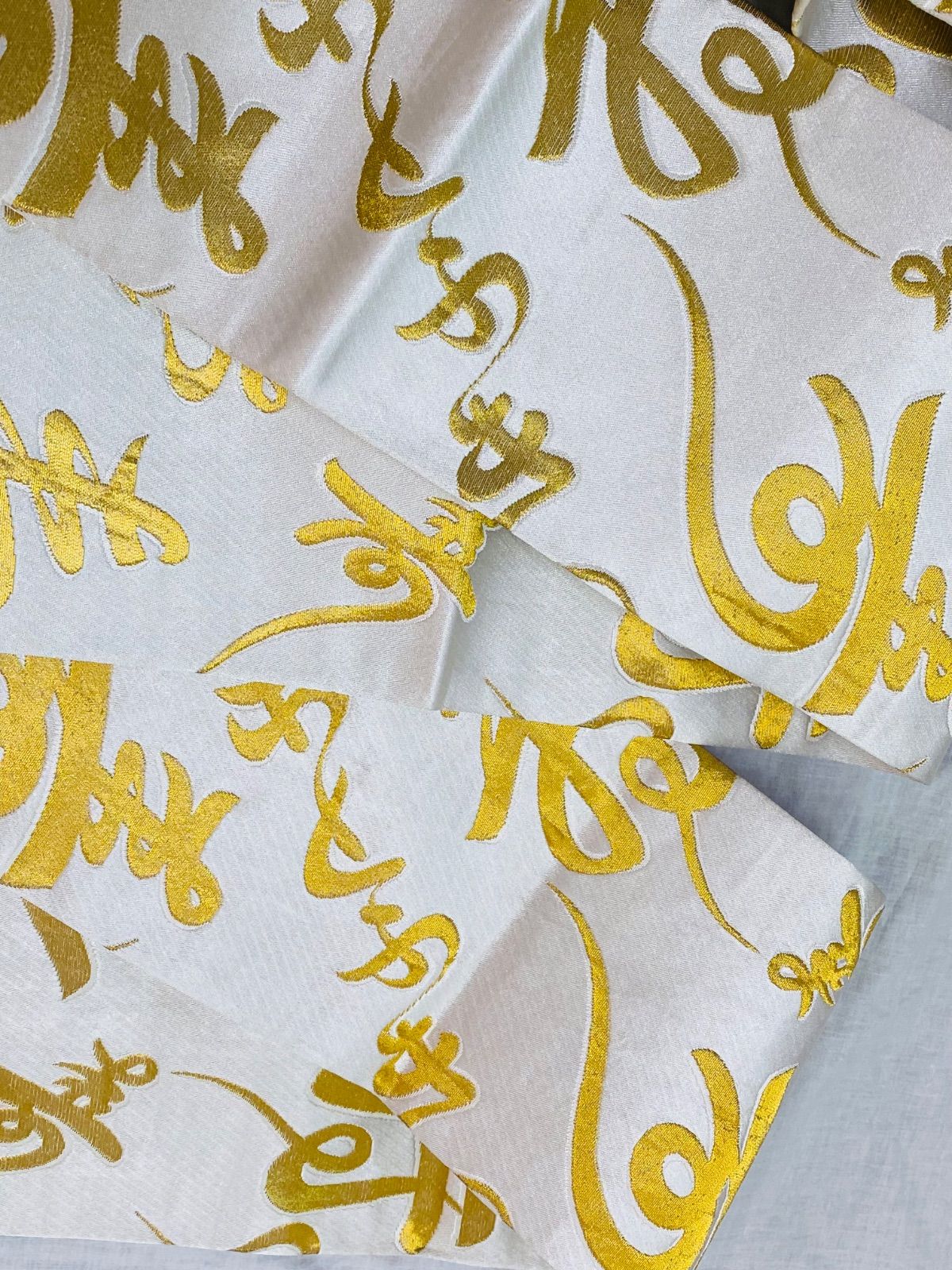【帯】半幅帯 踊り用帯 白×ゴールドカラー 文字柄 寿 正絹 着物 和装 OBI71