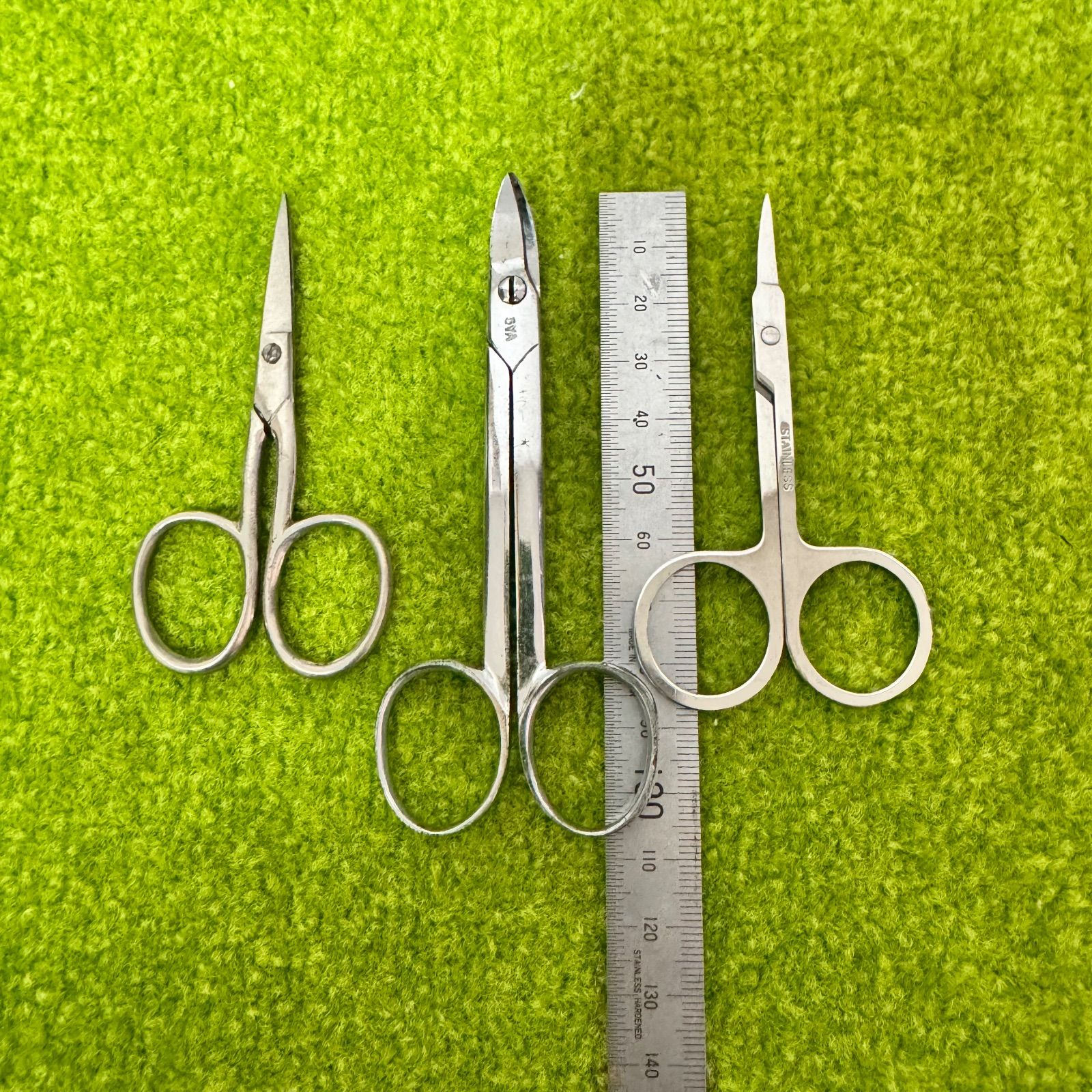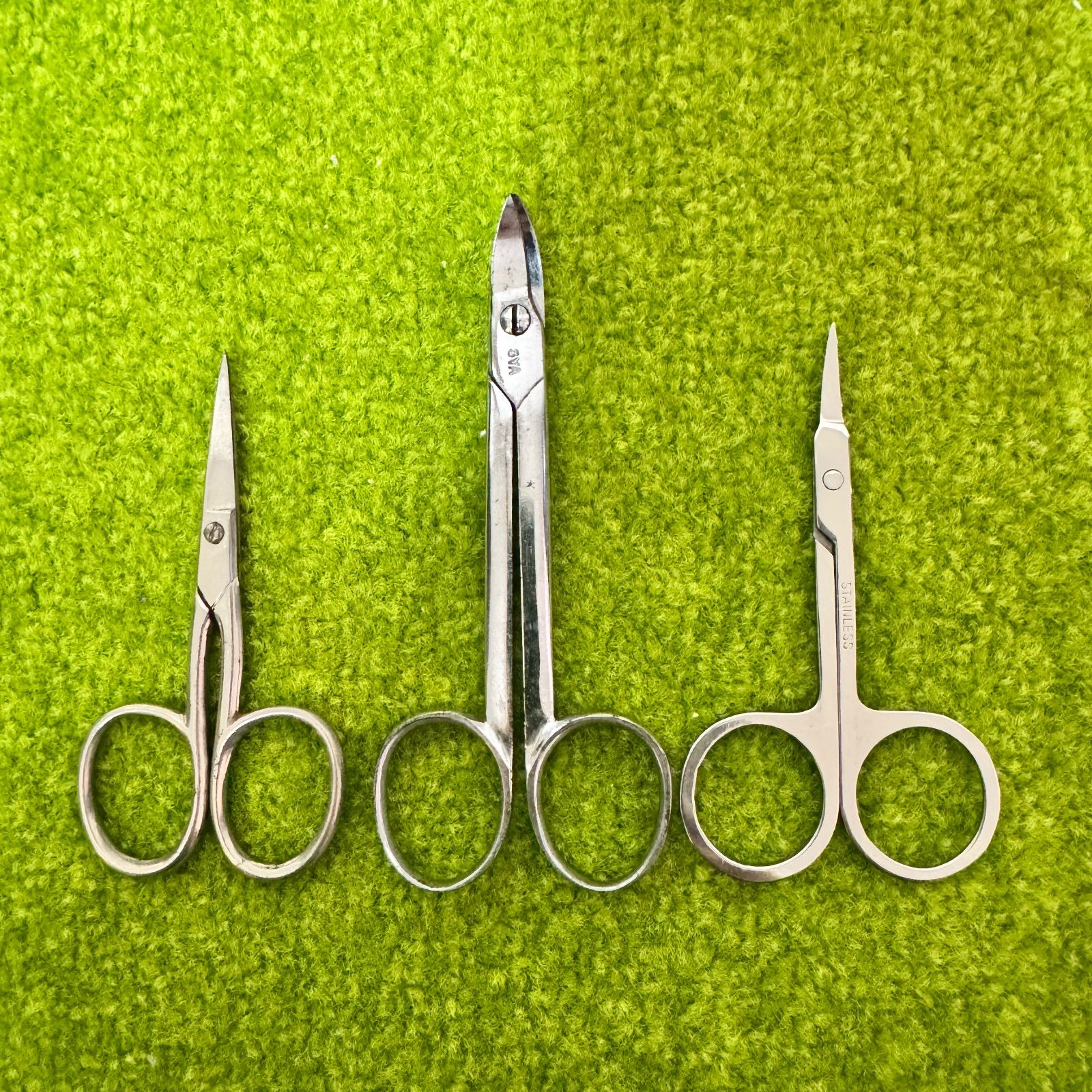 歯科治療における金属冠(金冠)の切断や調整、あるいは歯科技工用の精密な作業に使用されるハサミの3本セットです。細く鋭利な刃先を持つタイプや、カーブした刃先を持つタイプ(湾曲刃)など、用途に合わせた3種類です。