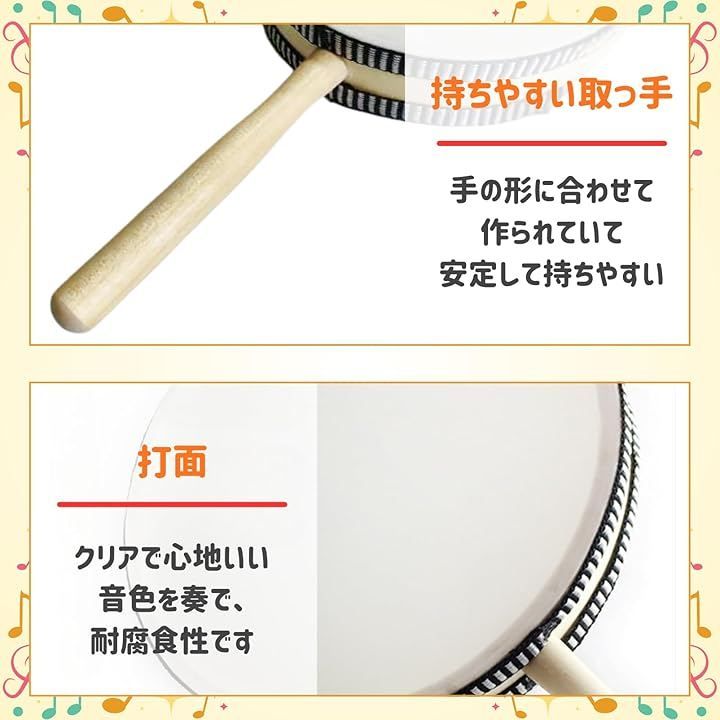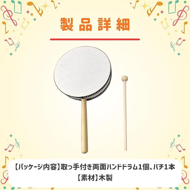 「パッケージ内容」取っ手付き両面ハンドドラム1個、バチ1本「打面サイズ」約15,20cm「素材」木製