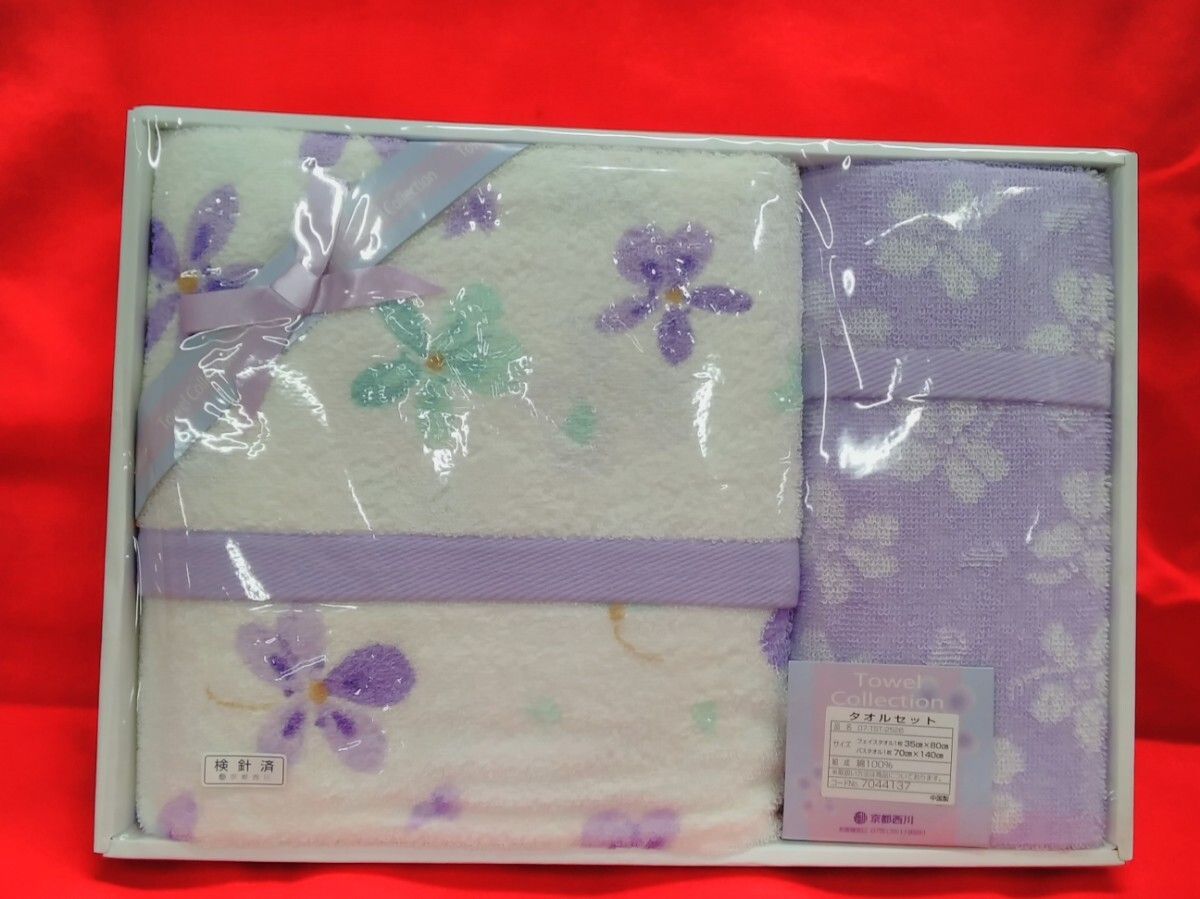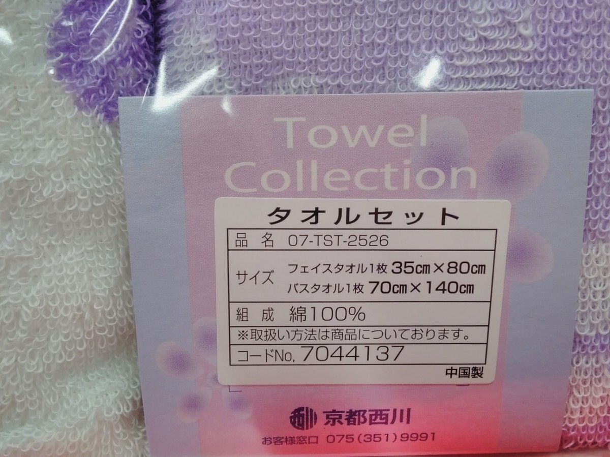 ☆京都西川/バスタオル(1枚)、フェイスタオル(1枚) 綿100% 中国製 パープル系