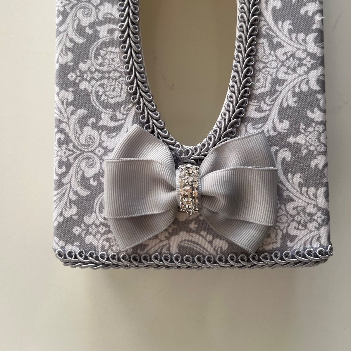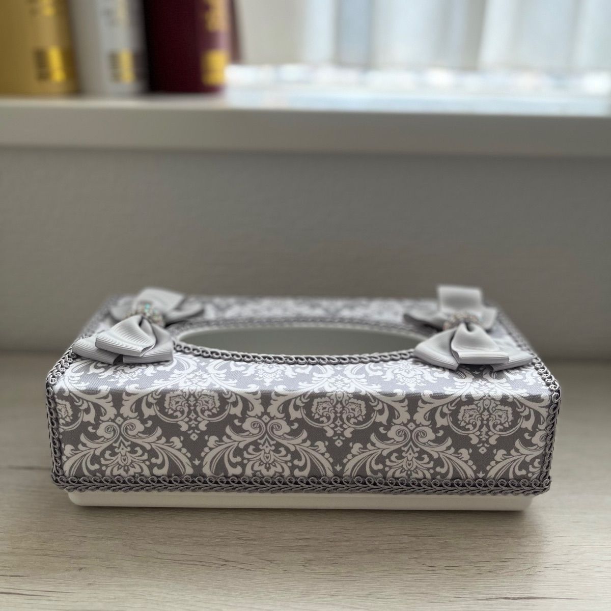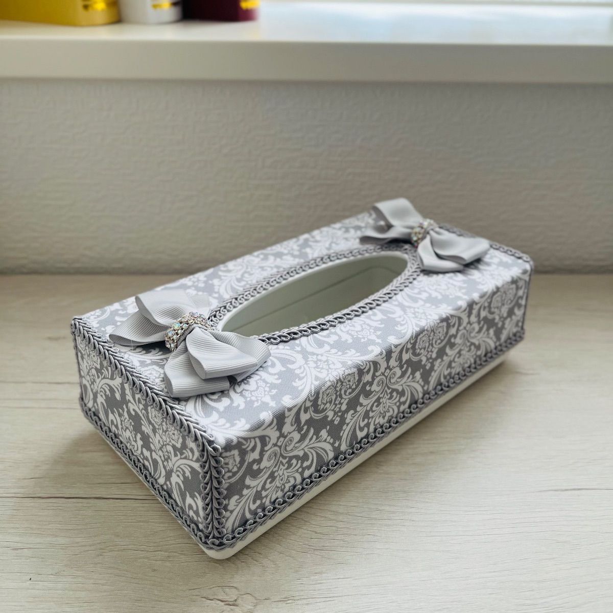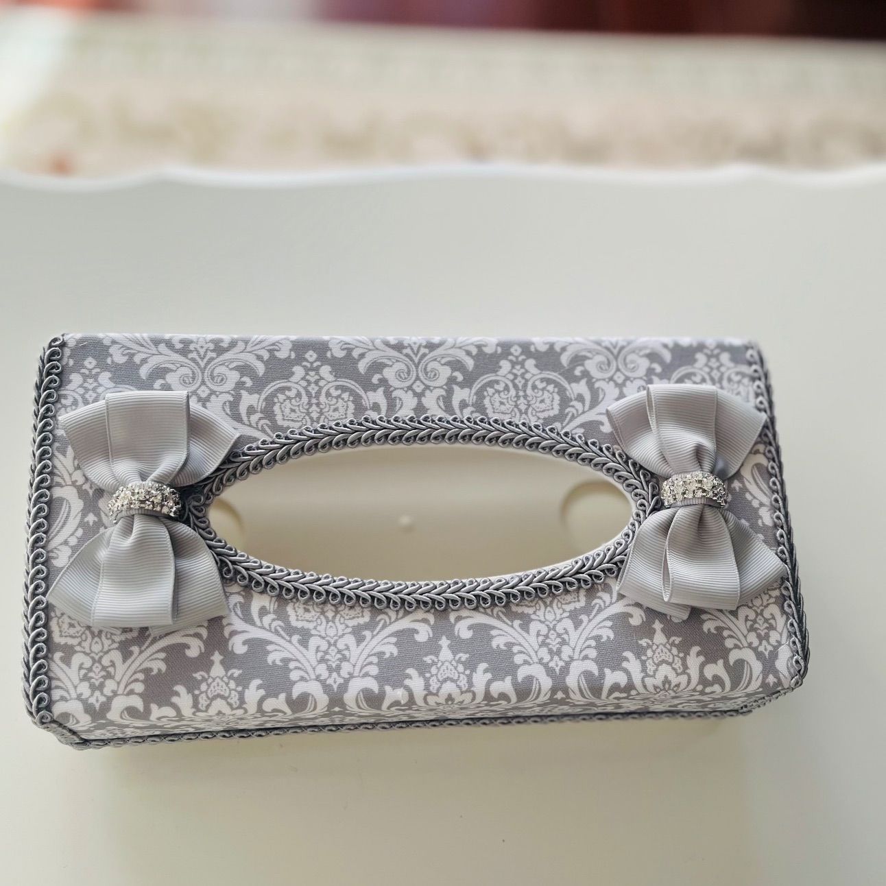 既製品のティッシュケースを上品なグレーのダマスク柄の生地とブレードでカルトナージュ風に装飾致しました。