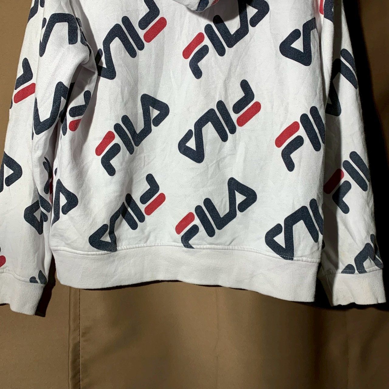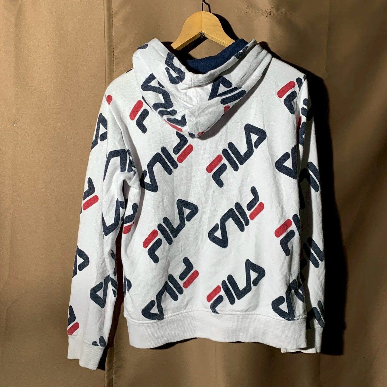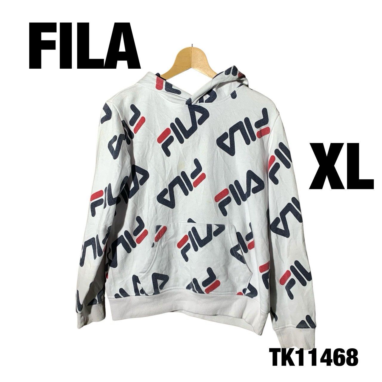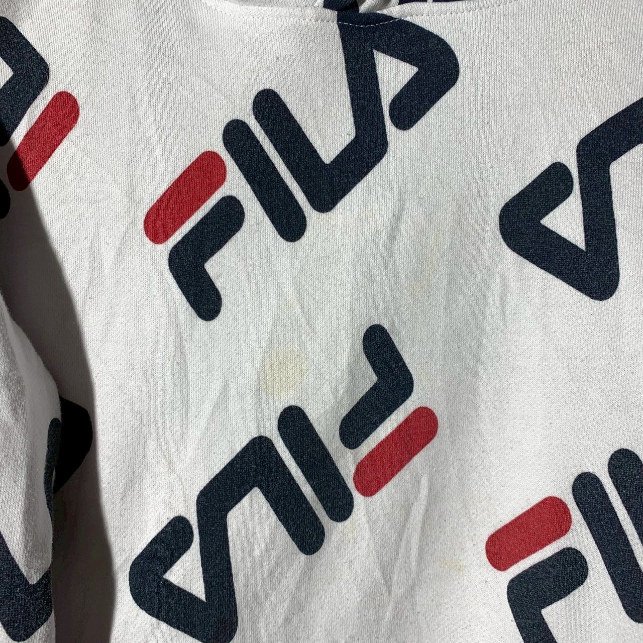 FILA ホワイト フーディー XL ロゴ 総柄 パーカー レディース プルオーバー 秋冬 古着 TK1468