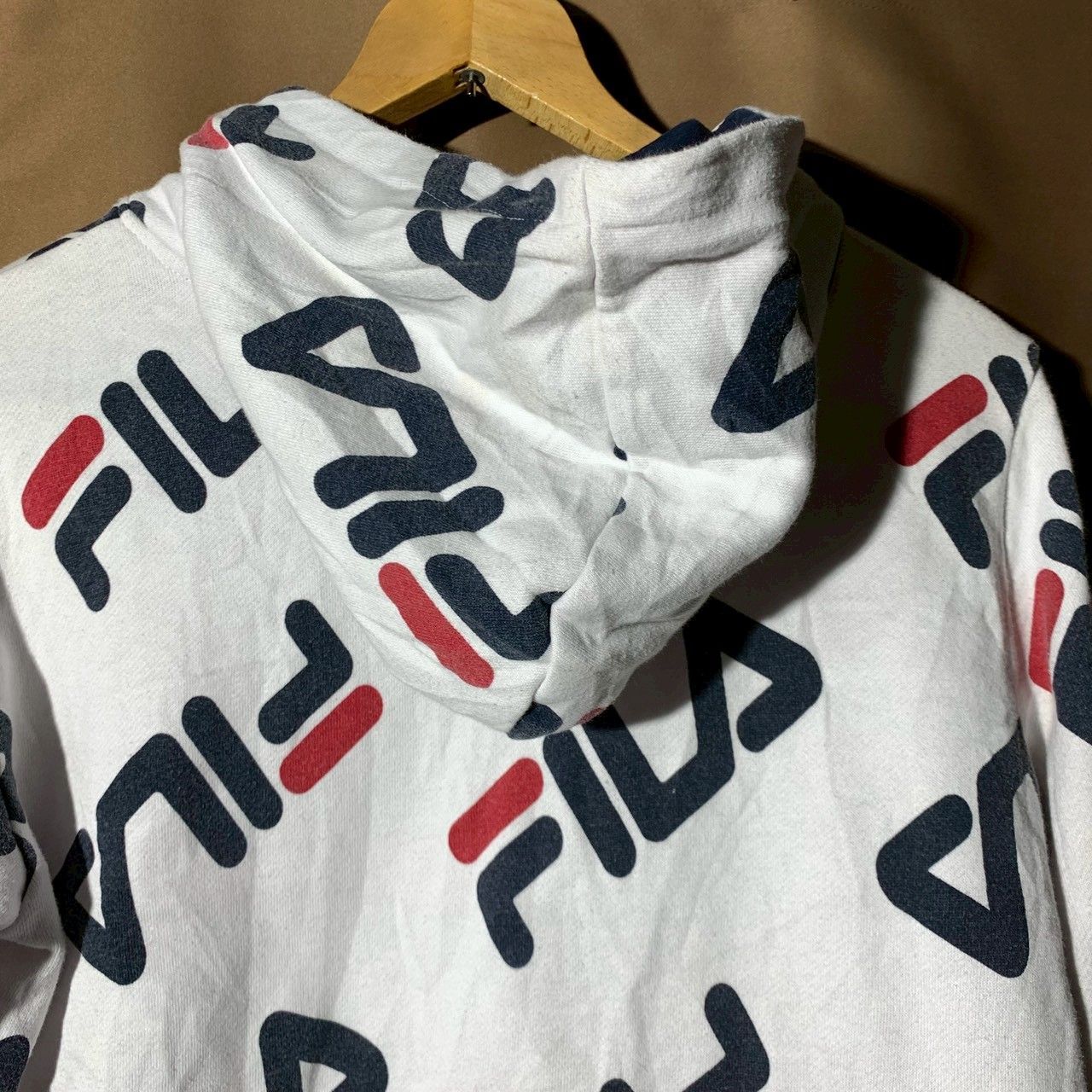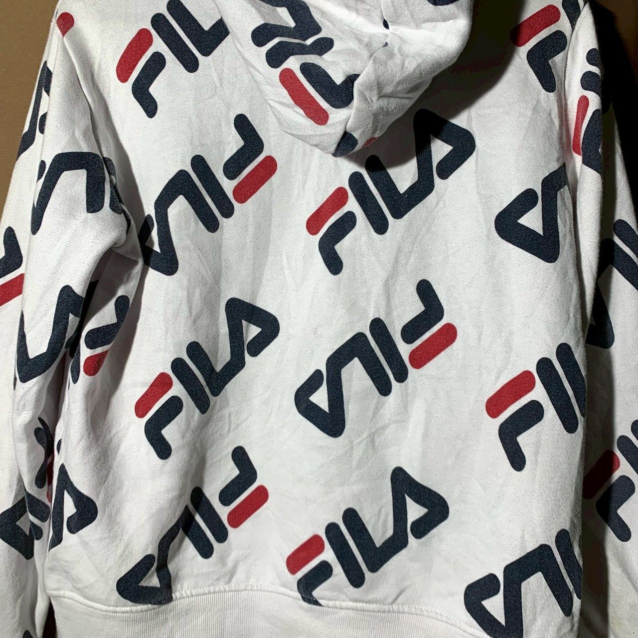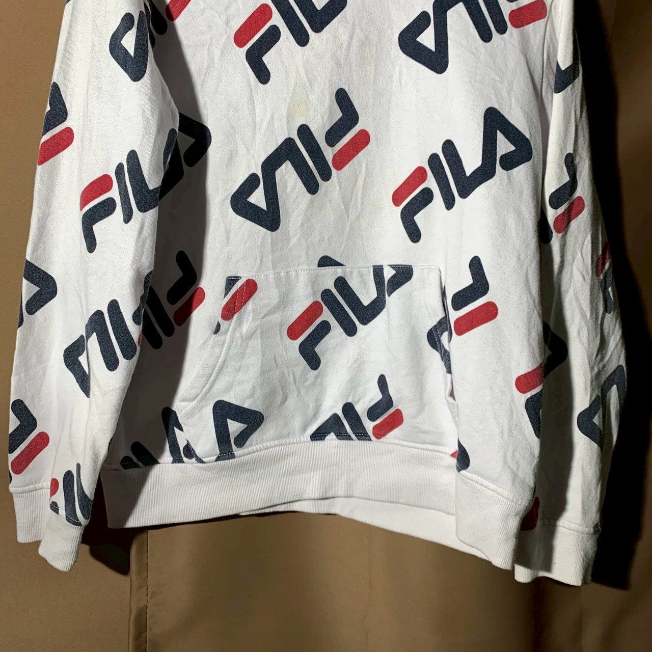 FILA ホワイト フーディー XL ロゴ 総柄 パーカー レディース プルオーバー 秋冬 古着 TK1468