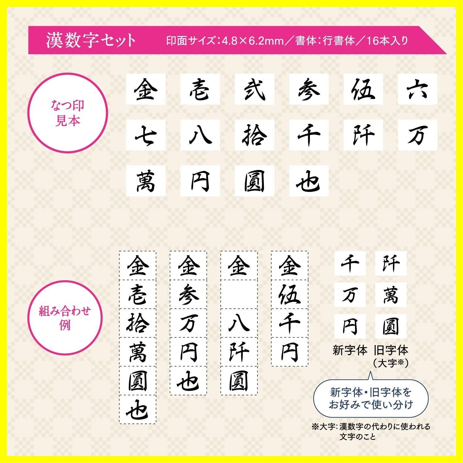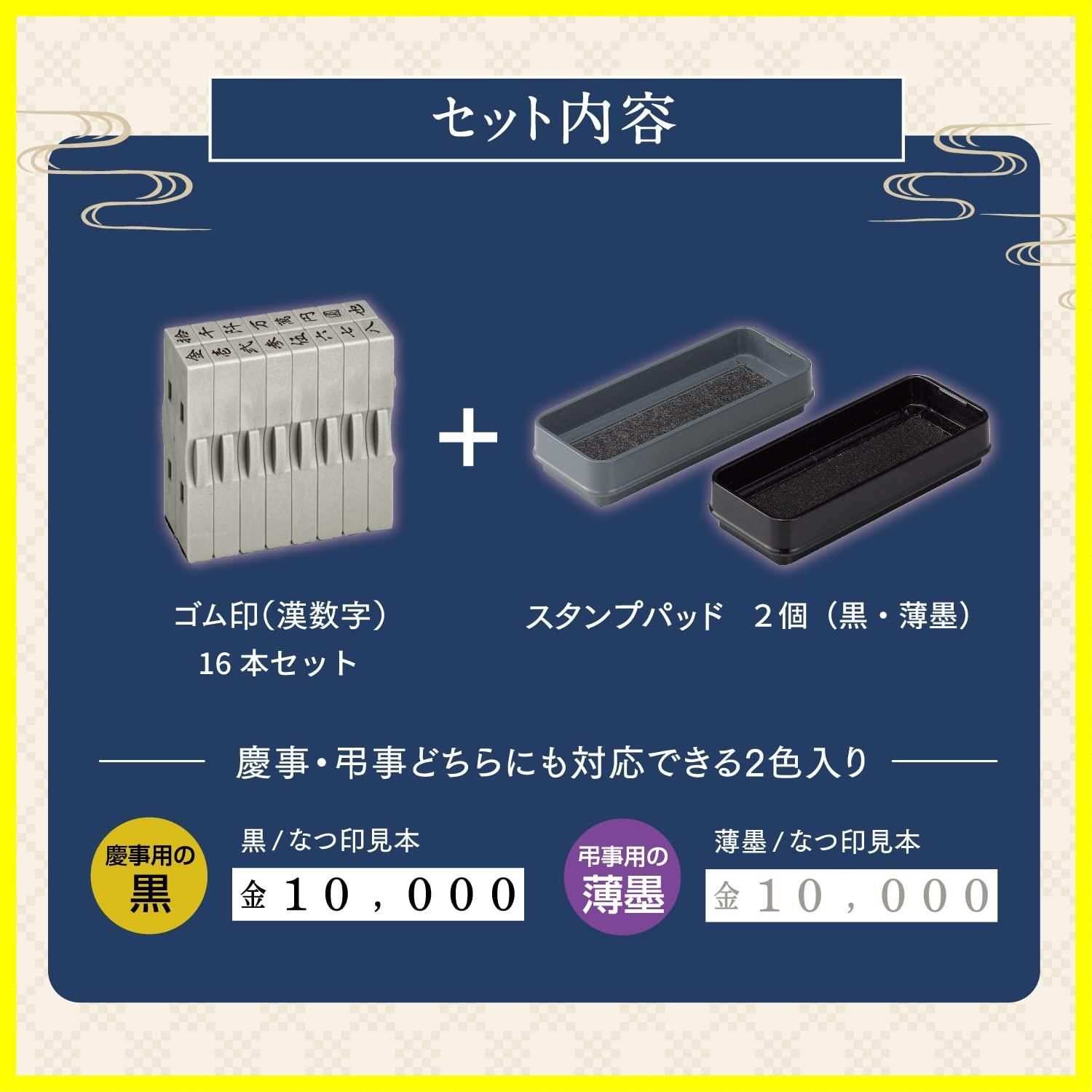 セット内容漢数字ゴム印16本、スタンプパッド2色(黒、薄墨)