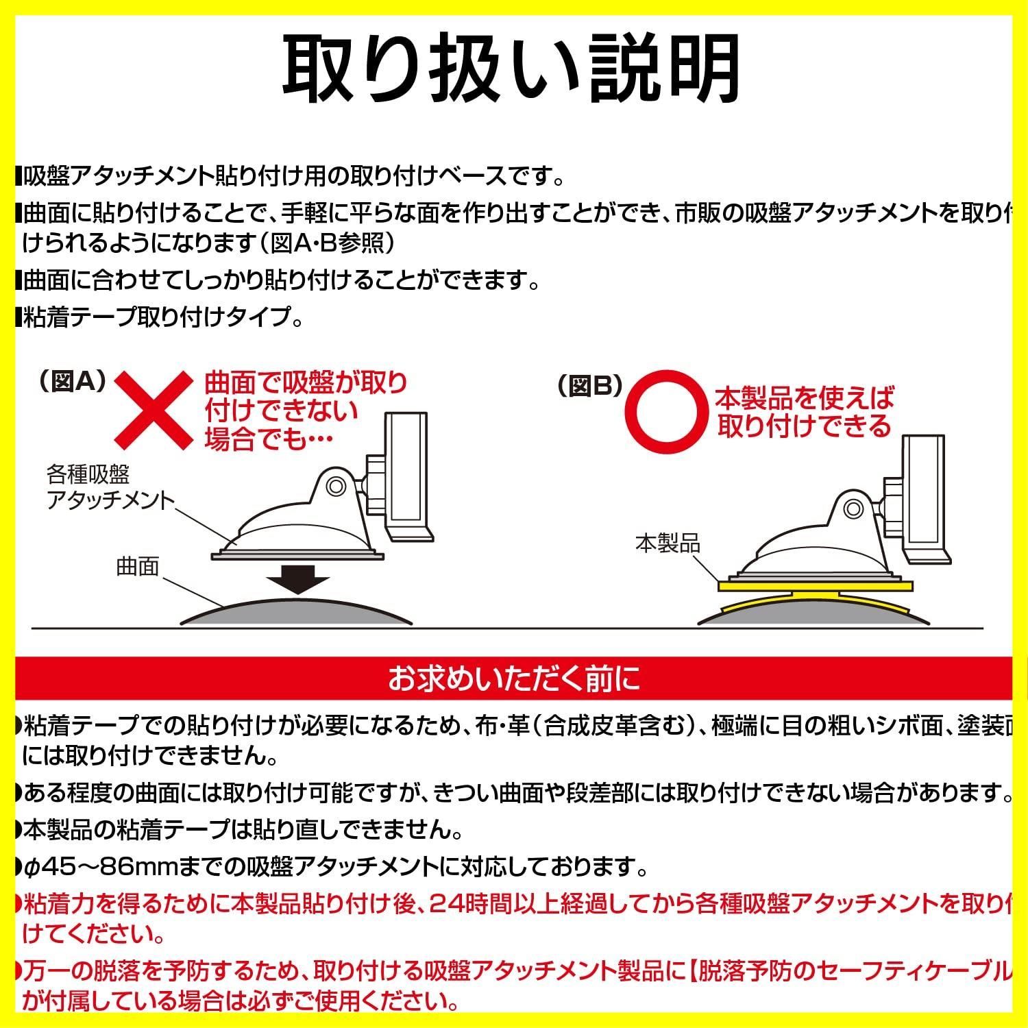 製品概要:曲面に貼り付けて、吸盤を貼り付けるための平らな面を作り出すためのベース。