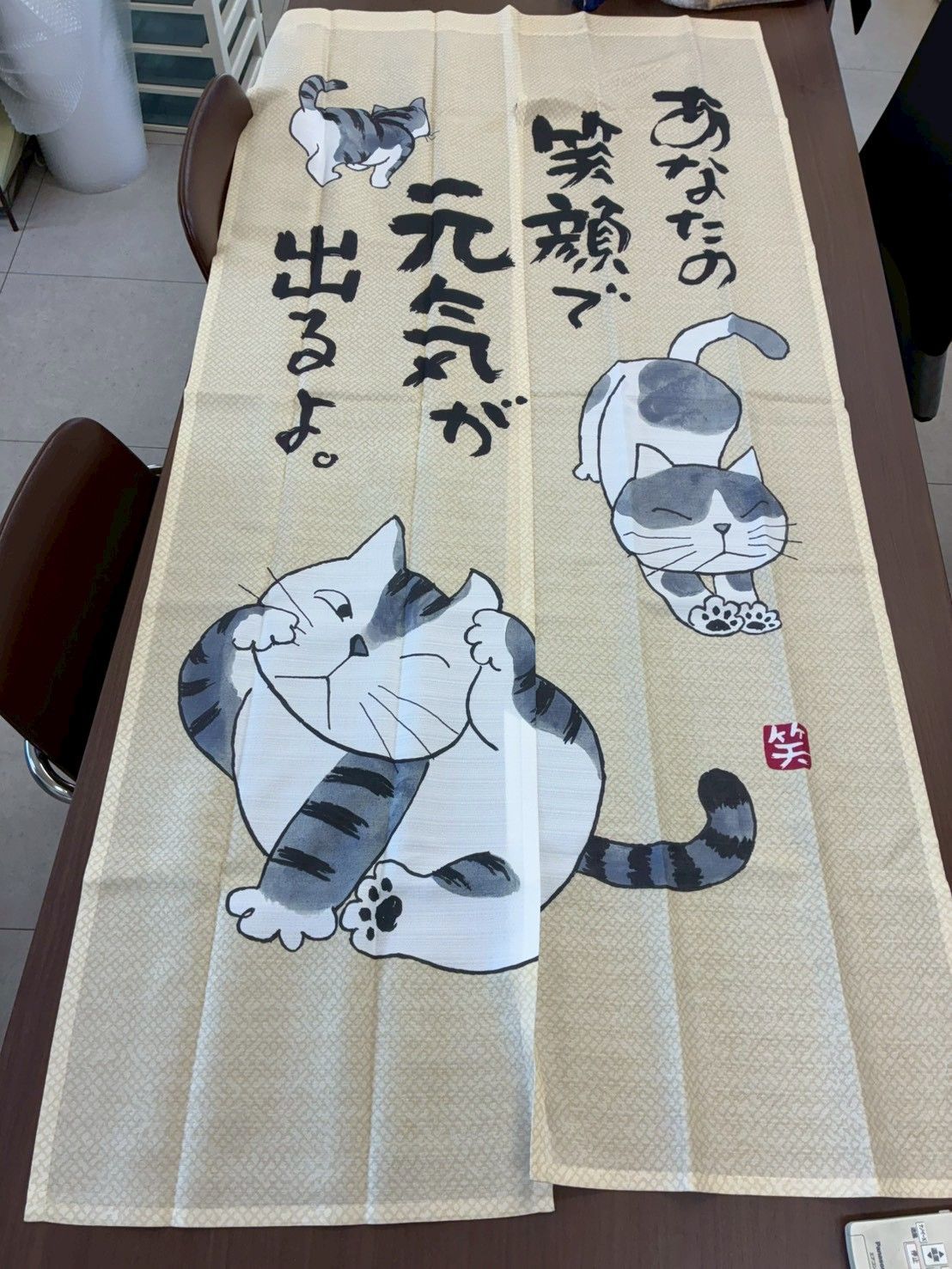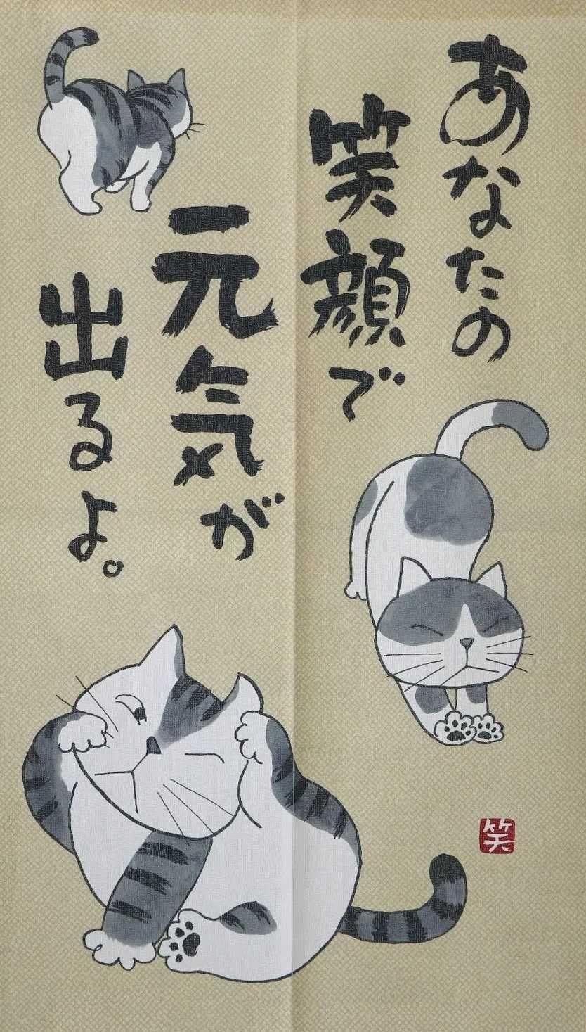 【デザイン】カット済みタイプ暖簾。絵柄の可愛くておしゃれな和風ネコ柄のれんです。和室、洋室問わずお使いいただけるおしゃれなデザインとなります。お気に入りの一枚で、インテリアの気分転換になります。