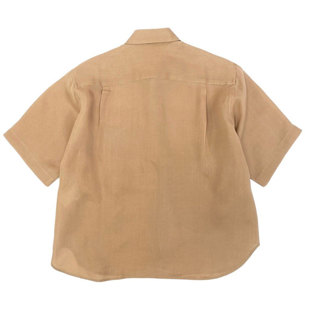 AURALEE(オーラリー)の半袖シルクシャツで、コーラルピンク系の柔らかな色合いが印象的です。素材には上品な光沢を抑えたシルクを使用し、なめらかで軽やかな肌触りに仕上げられています。シンプルな無地デザインに、ボックスシルエットと比翼仕様がミニマルな雰囲気を演出します。デニムやスラックス、スカートまで合わせやすく、夏の大人カジュアルやリラックススタイルにおすすめの一着です。