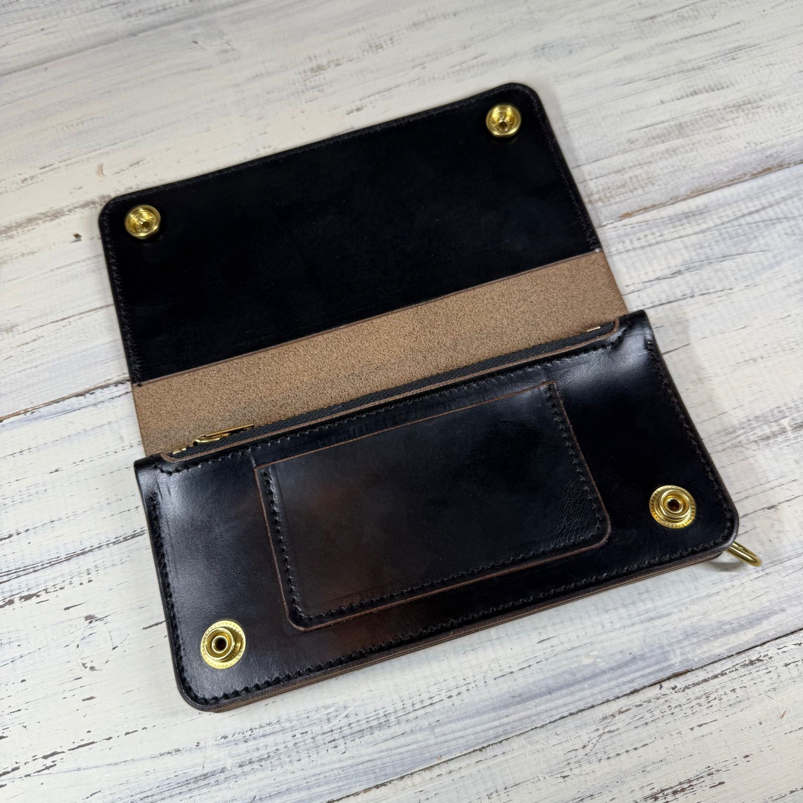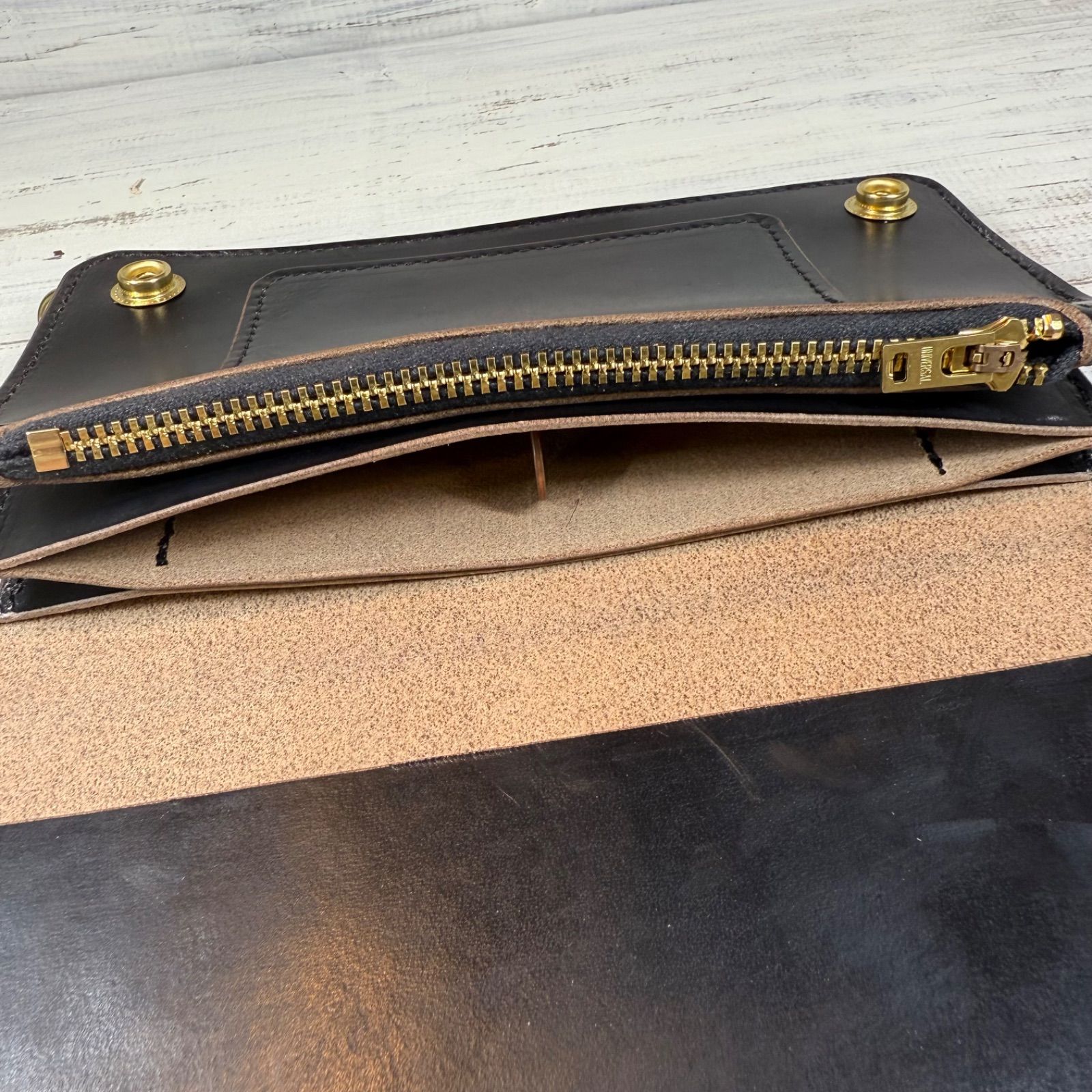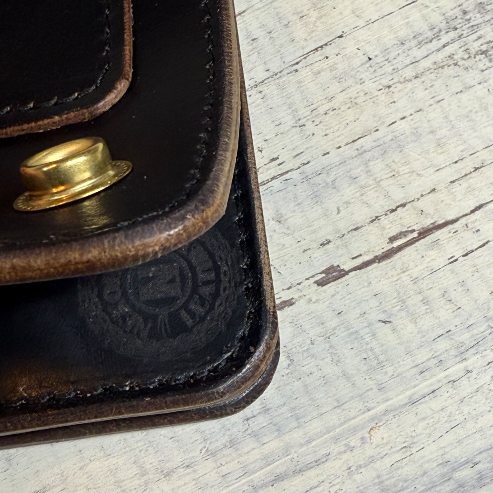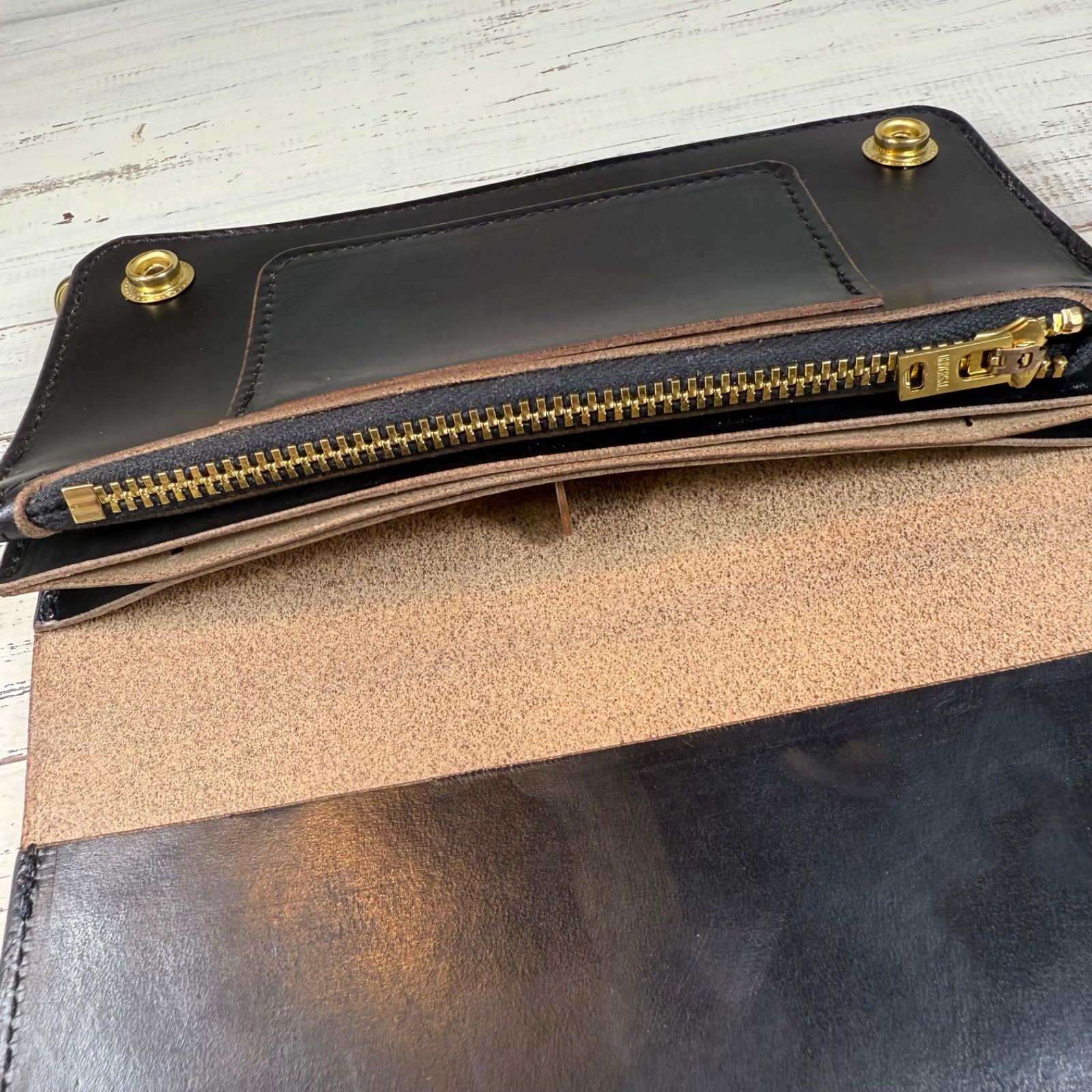1905年創業のアメリカHORWEEN(ホーウィン)社によるヘビーオイルドレザーです。一般的なオイルドレザーよりさらに多量のオイルを浸透させることで得られるくったりした柔らかさと重量感が特徴。革を揉むと内部油分の移動によって色味が変化(黒は変化が目視できません)するプルアップが見られるほか、蜜蝋も含まれているためブライドルレザーのように経年変化でロウ成分が浮き出てきます。