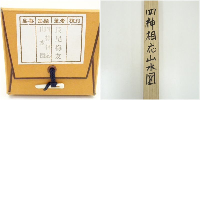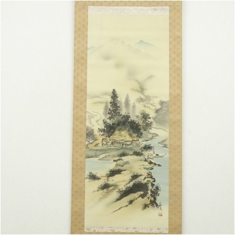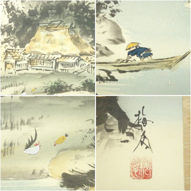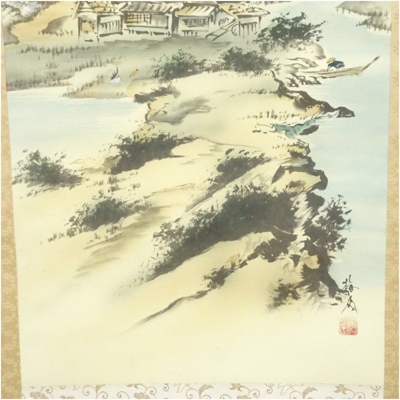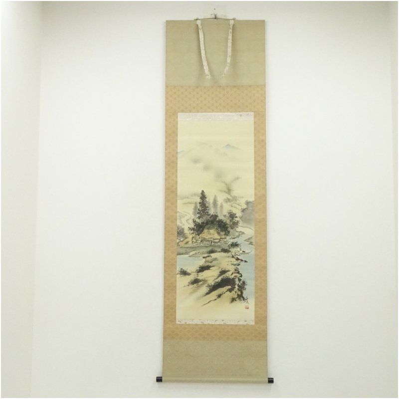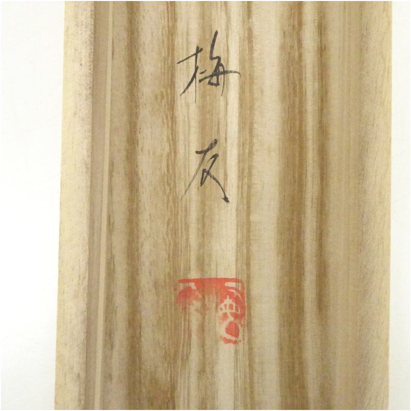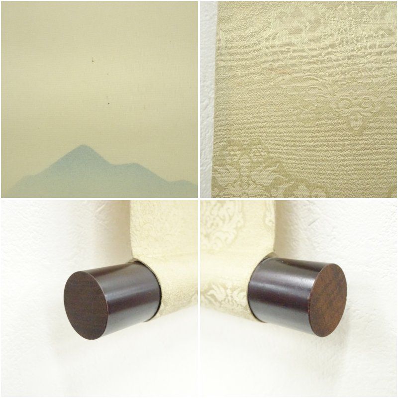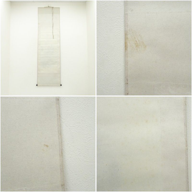 表具:表面上部に小さな薄いシミがわずかにあります。裏面にところどころ薄いシミや汚れがあり、両端に一部濃いシミがあります。表具下部軸棒付近に破れがあります。