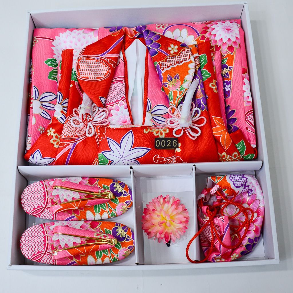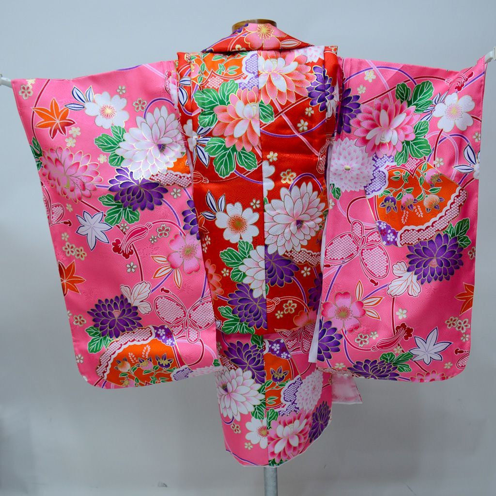 七五三 三歳 女児 被布 着物 フルセット ピンク×赤色 ポリエステル 3歳 3才 三才 女の子 祝着 お仕立て無料 NO0026