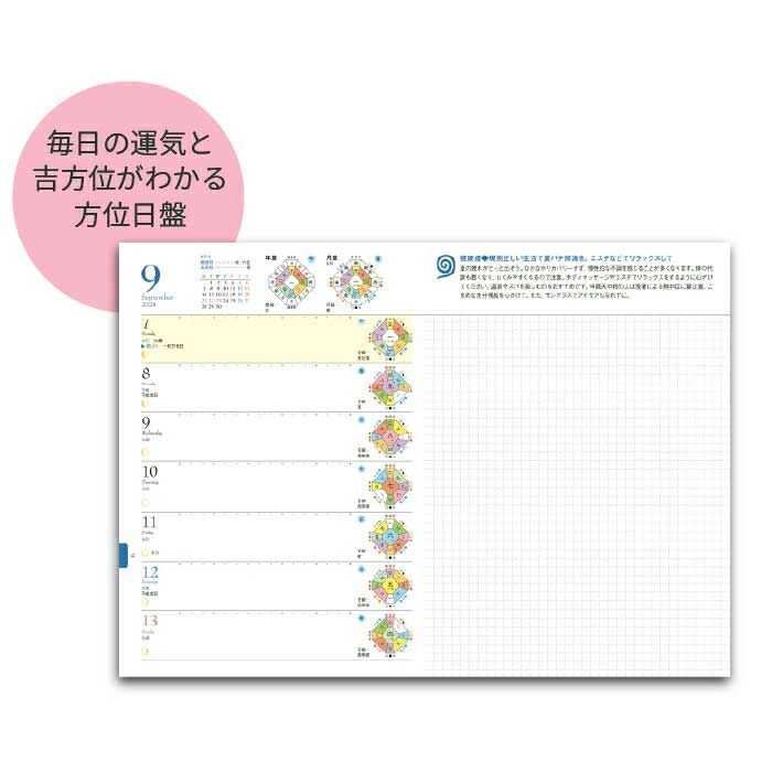 さらに週間のページには、毎日の運気と吉方位がわかる方位盤、日破(よくない方向)を掲載