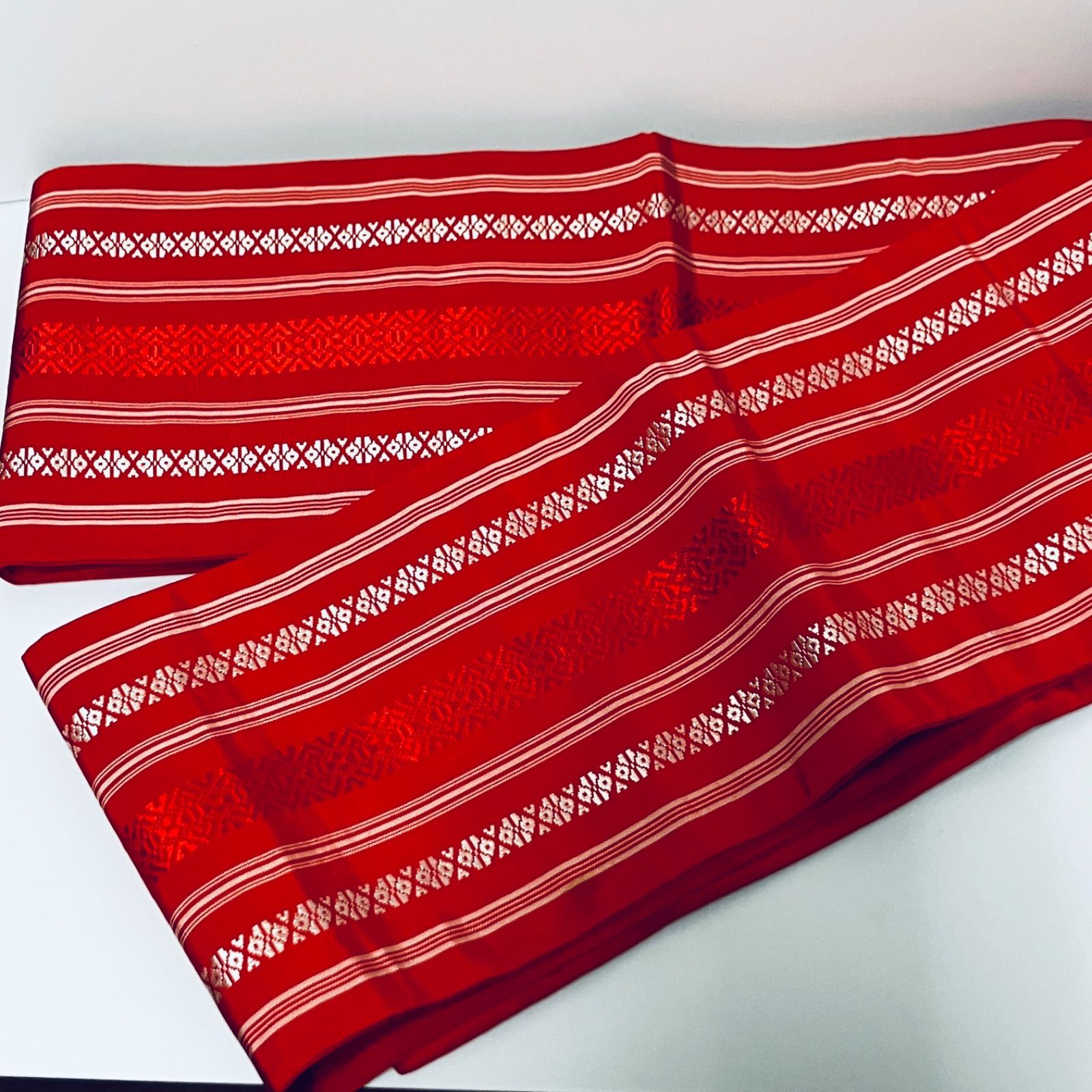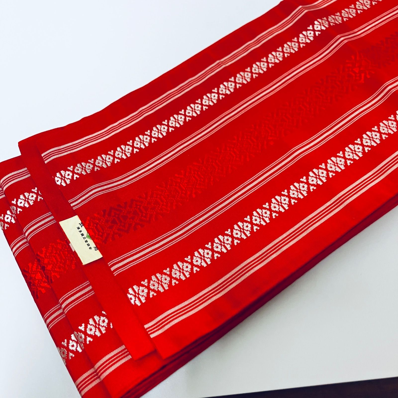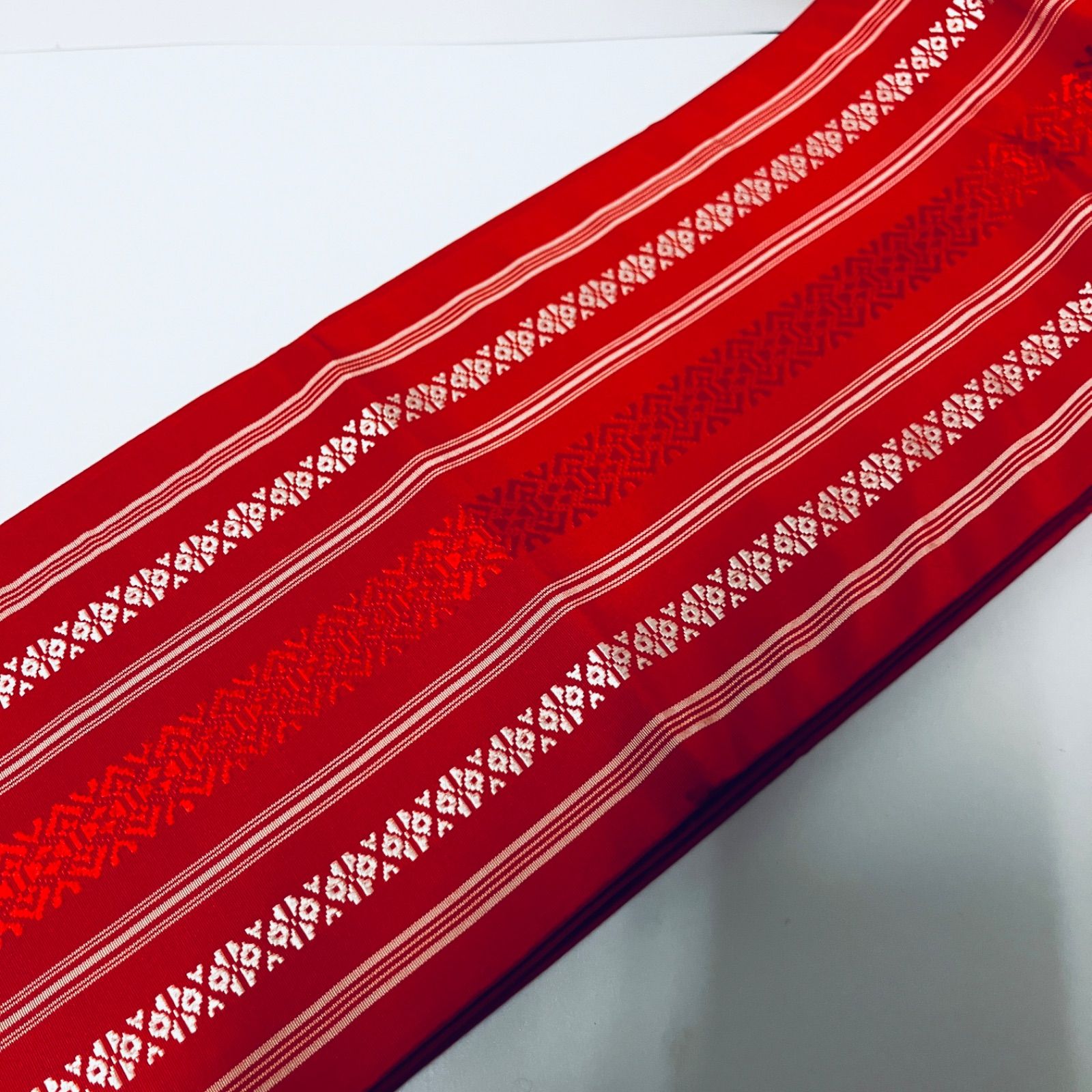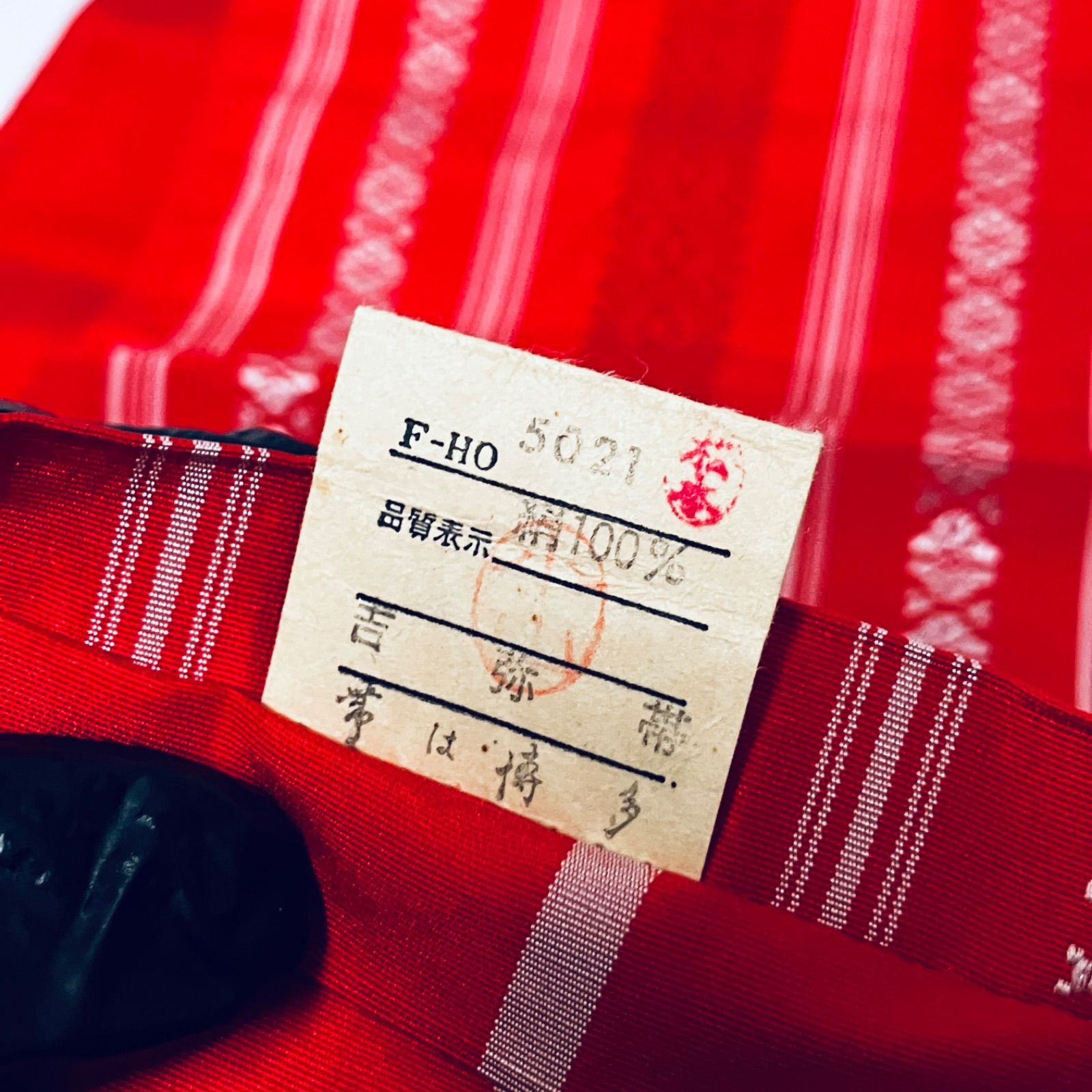 鮮やかな赤地に、博多織らしい縞文様と幾何学的な柄が織り出されており、