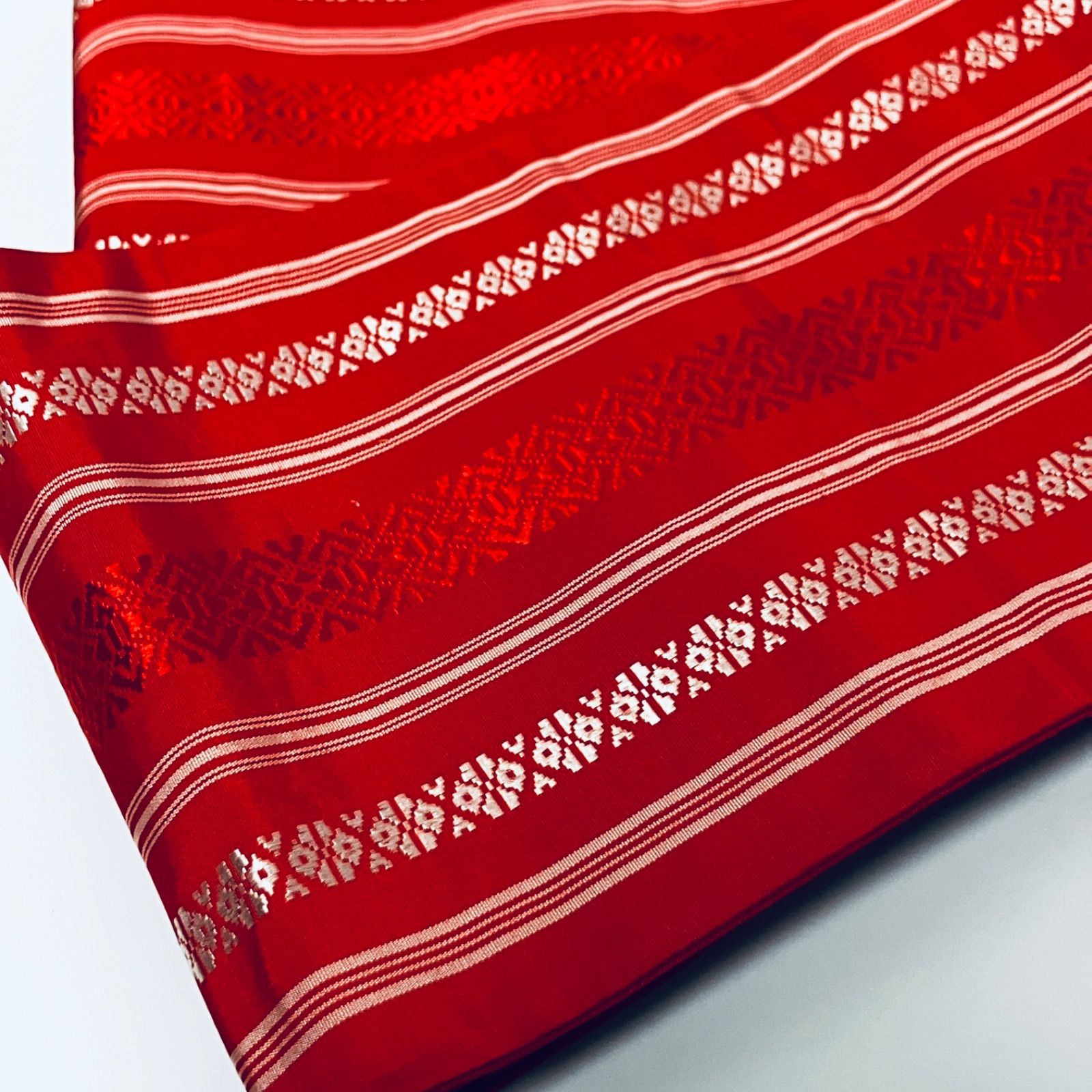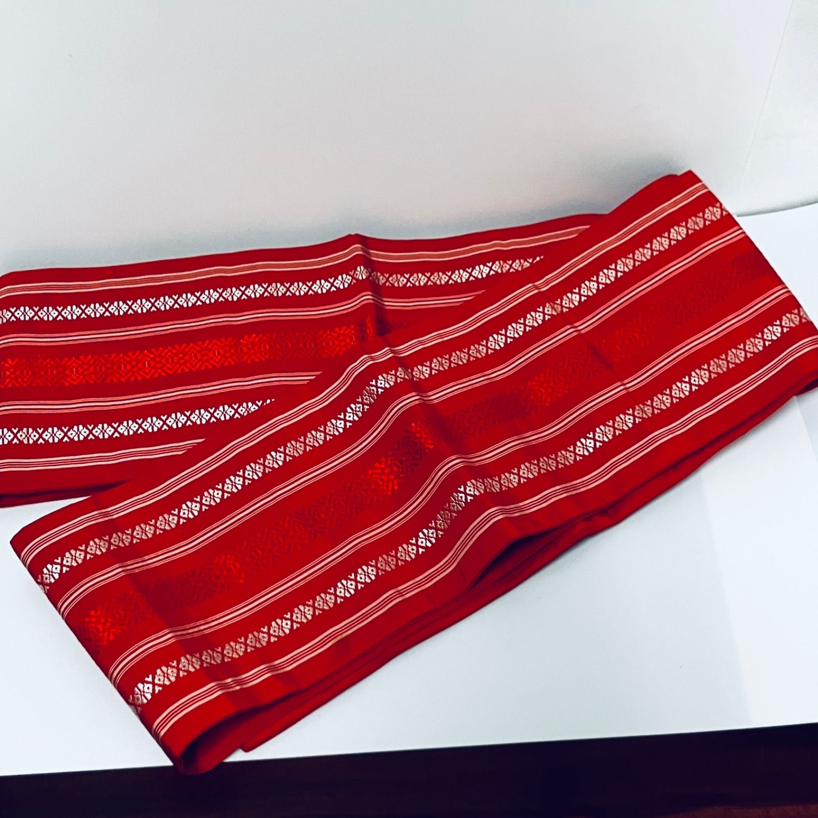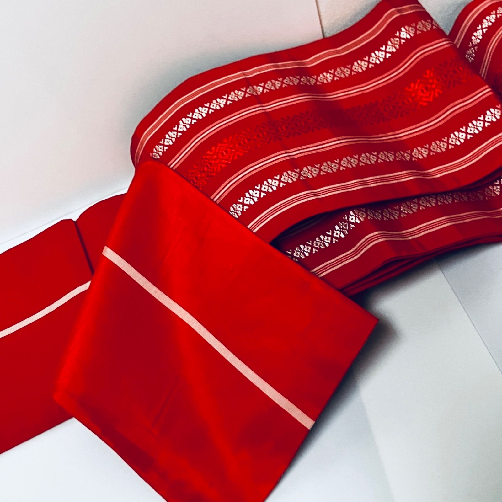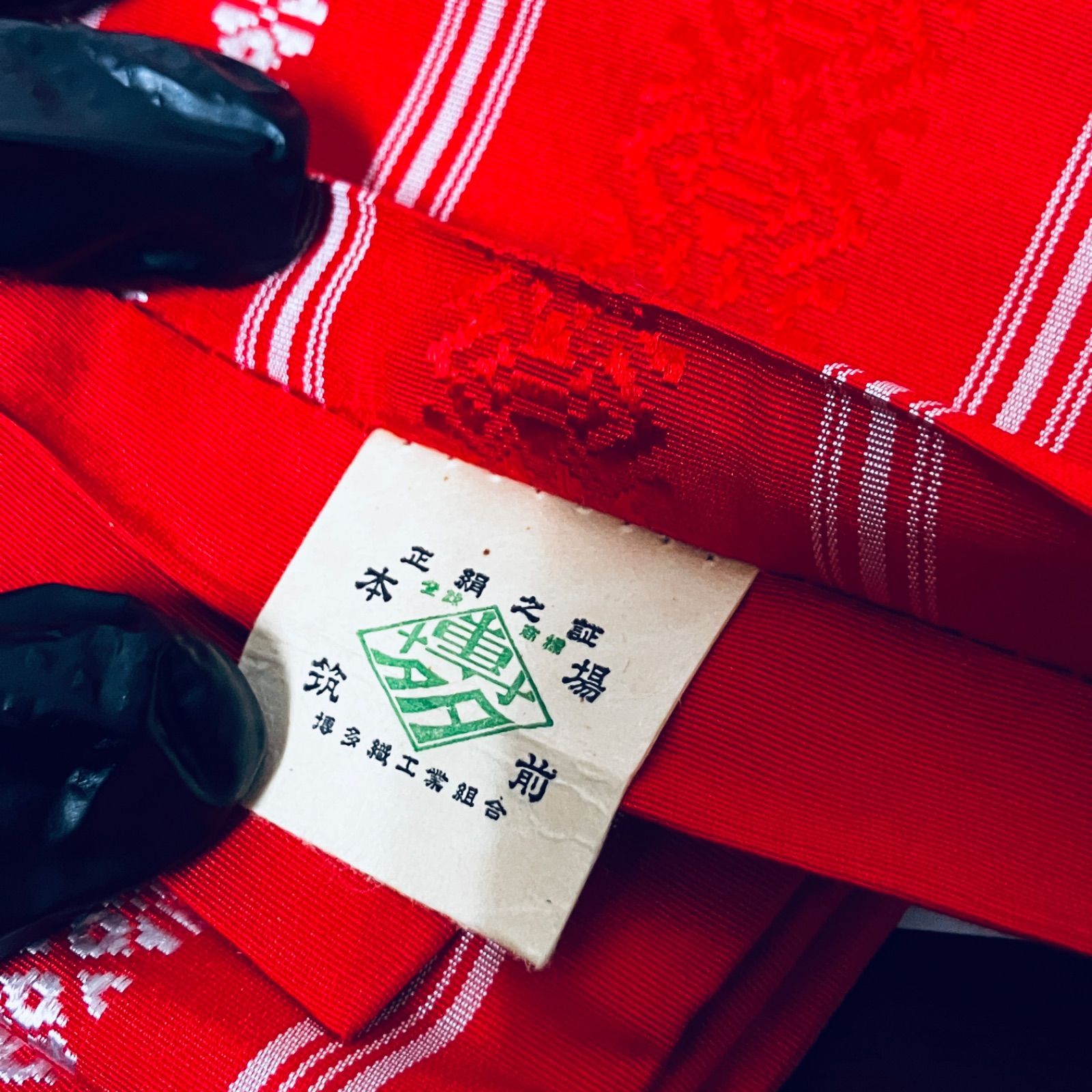 鮮やかな赤地に、博多織らしい縞文様と幾何学的な柄が織り出されており、