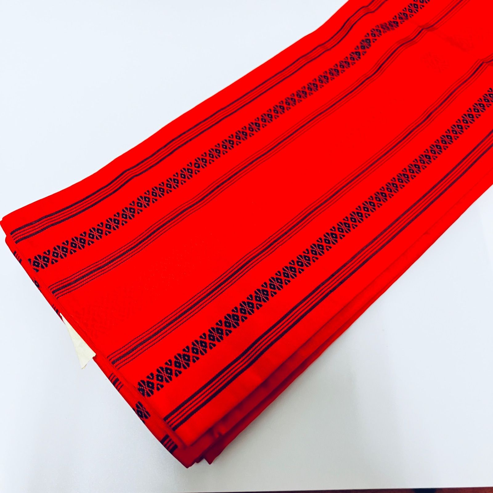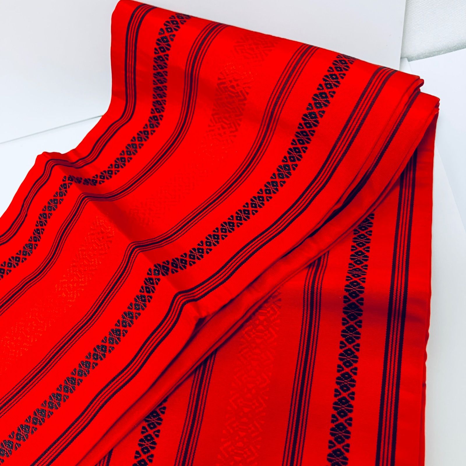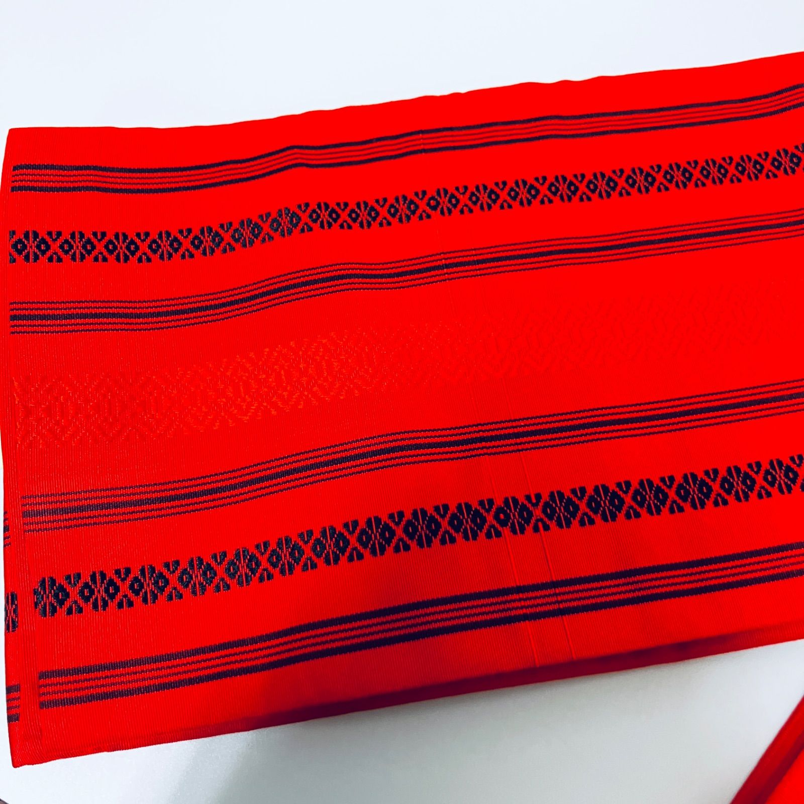 鮮やかな赤地に、博多織らしい縞文様と幾何学的な柄が織り出されており、