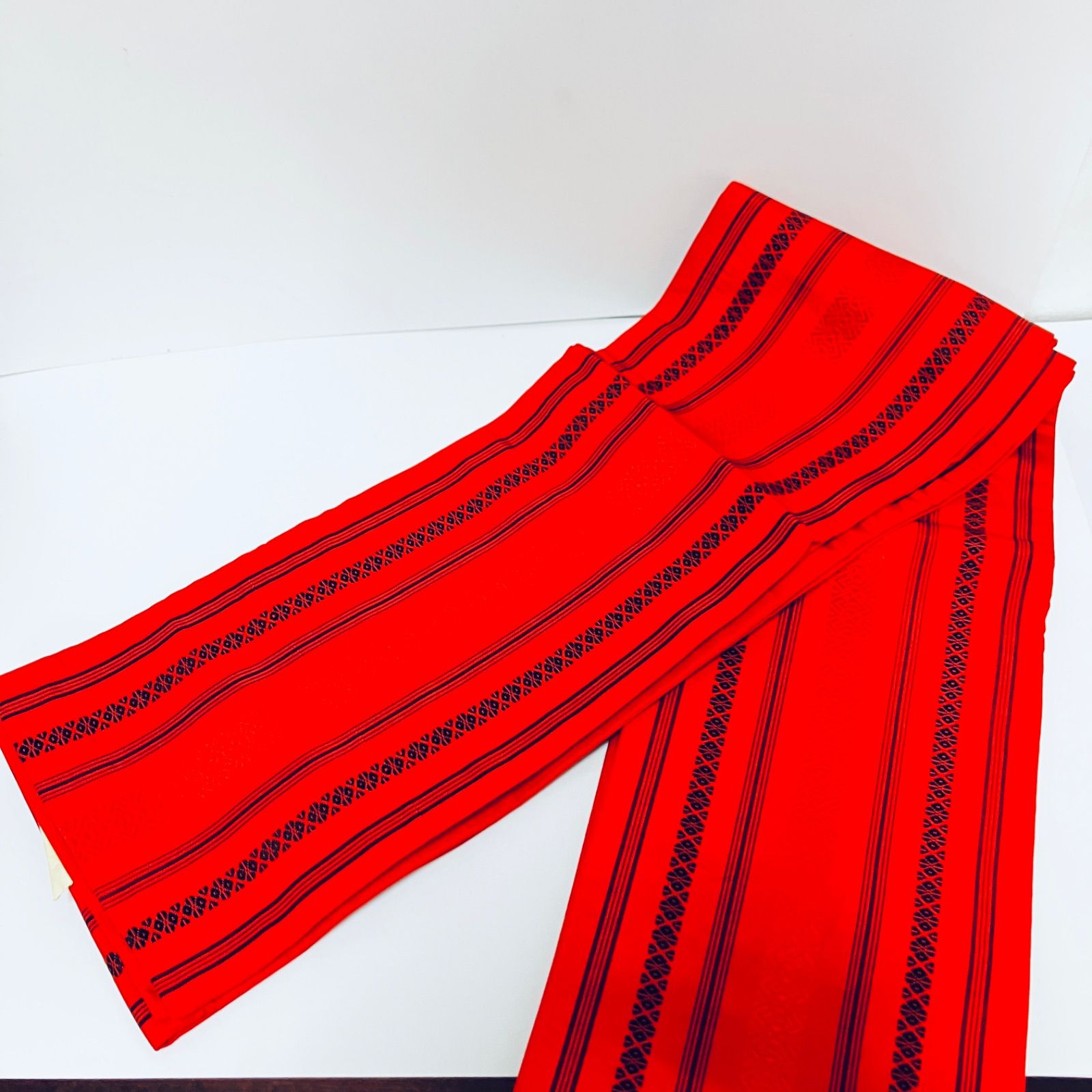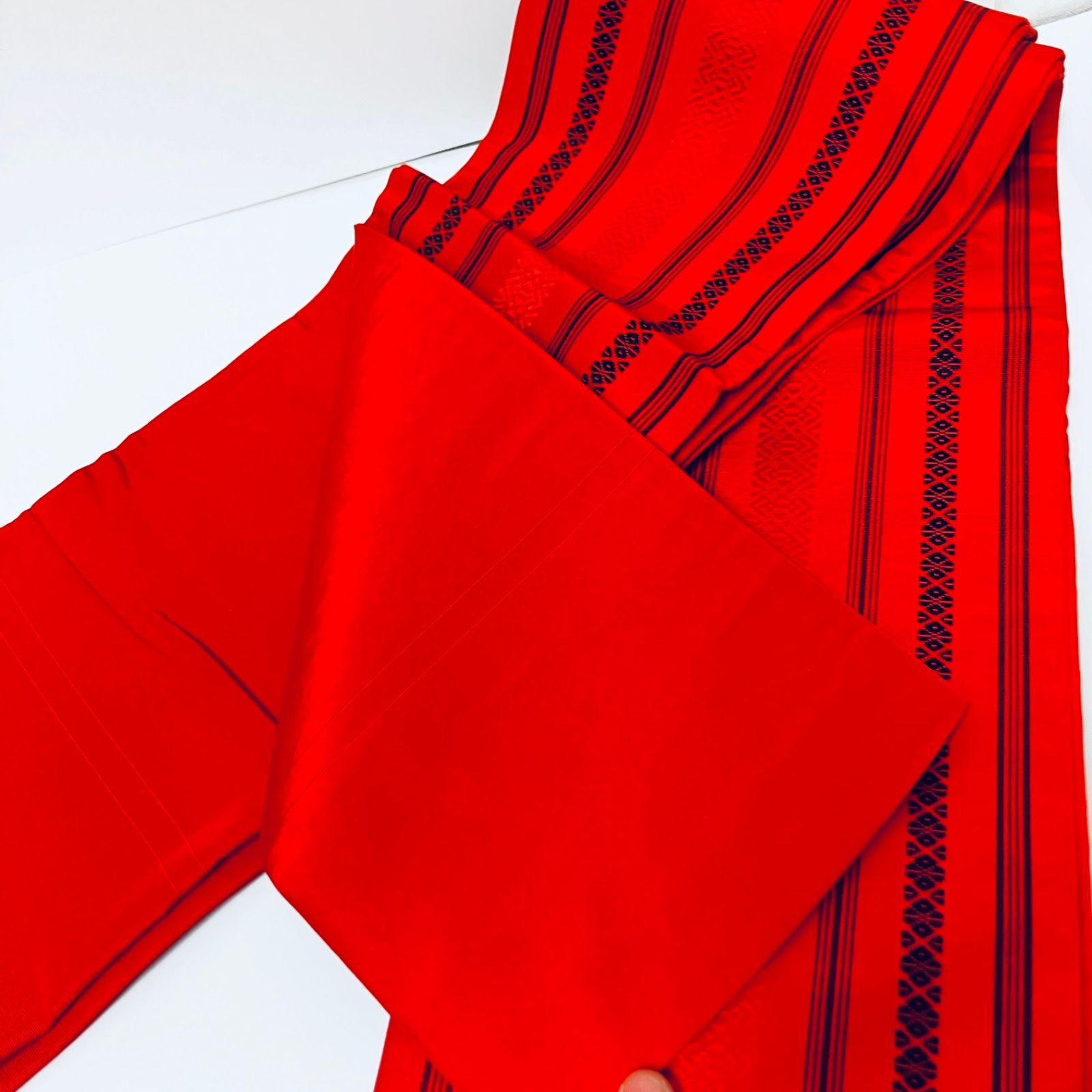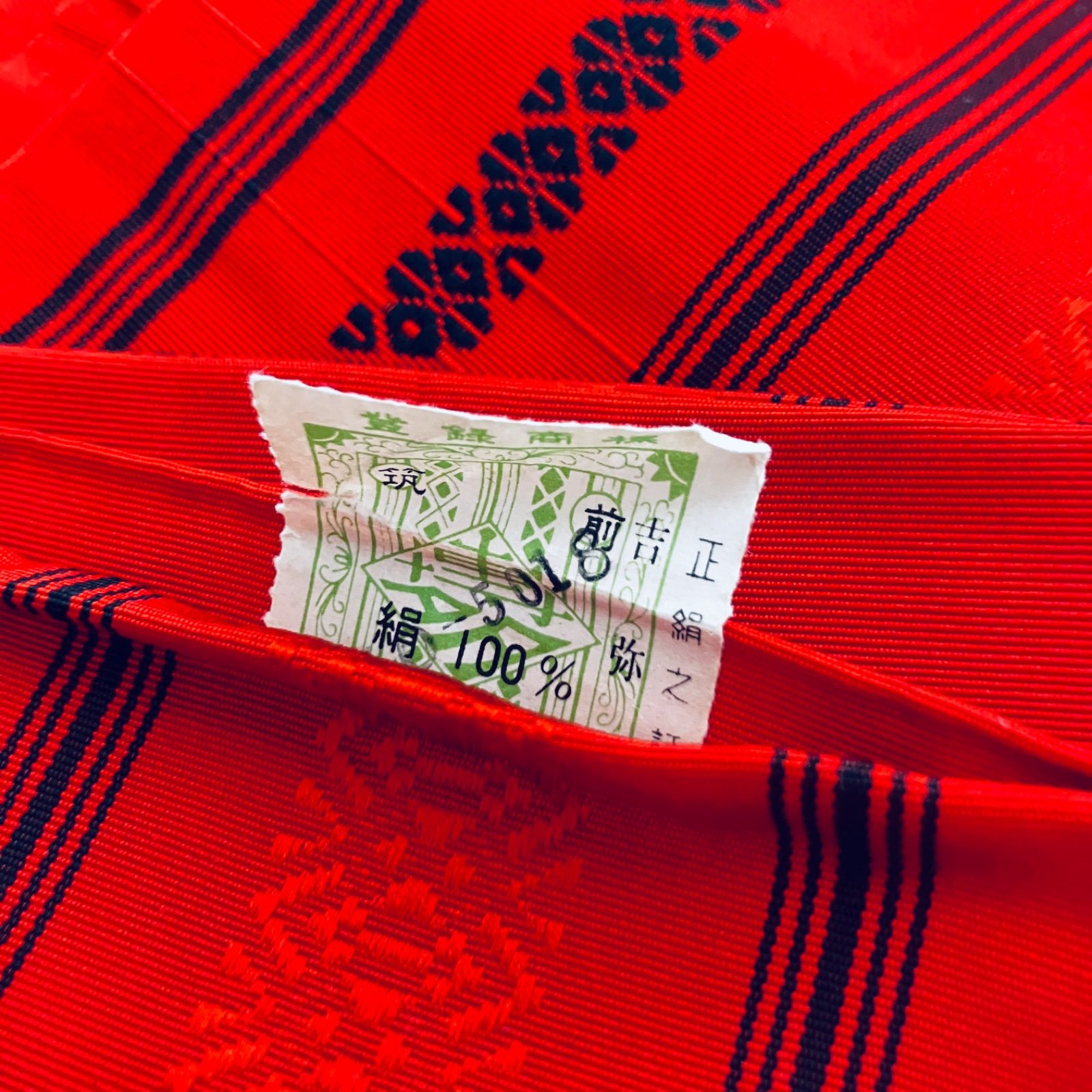 鮮やかな赤地に、博多織らしい縞文様と幾何学的な柄が織り出されており、