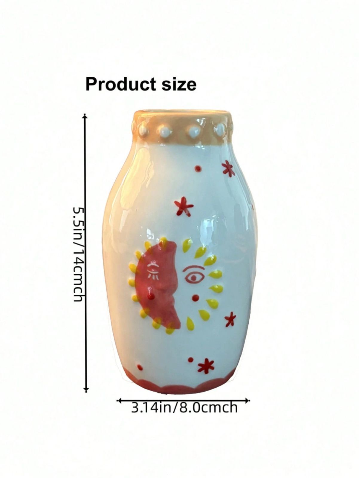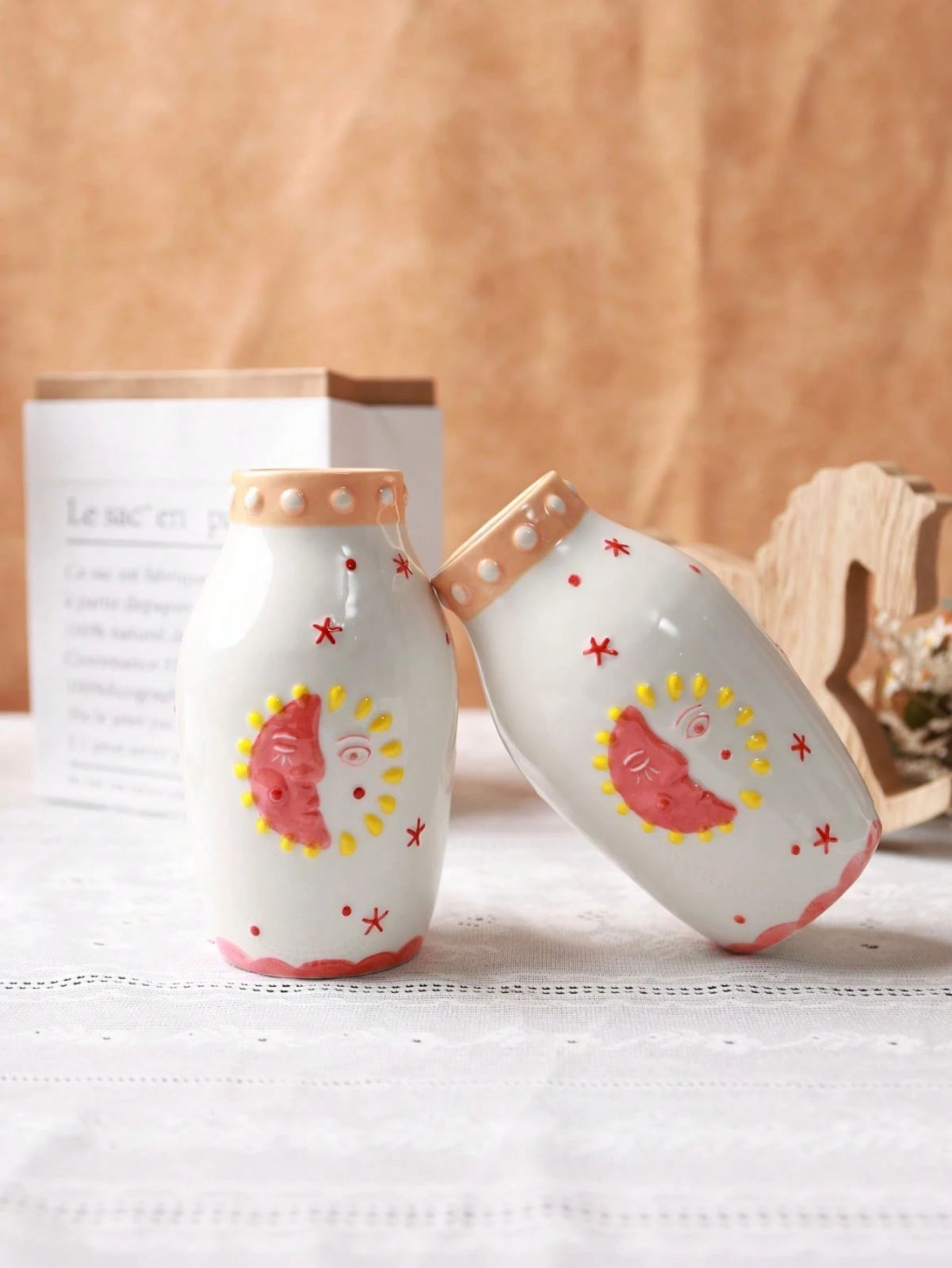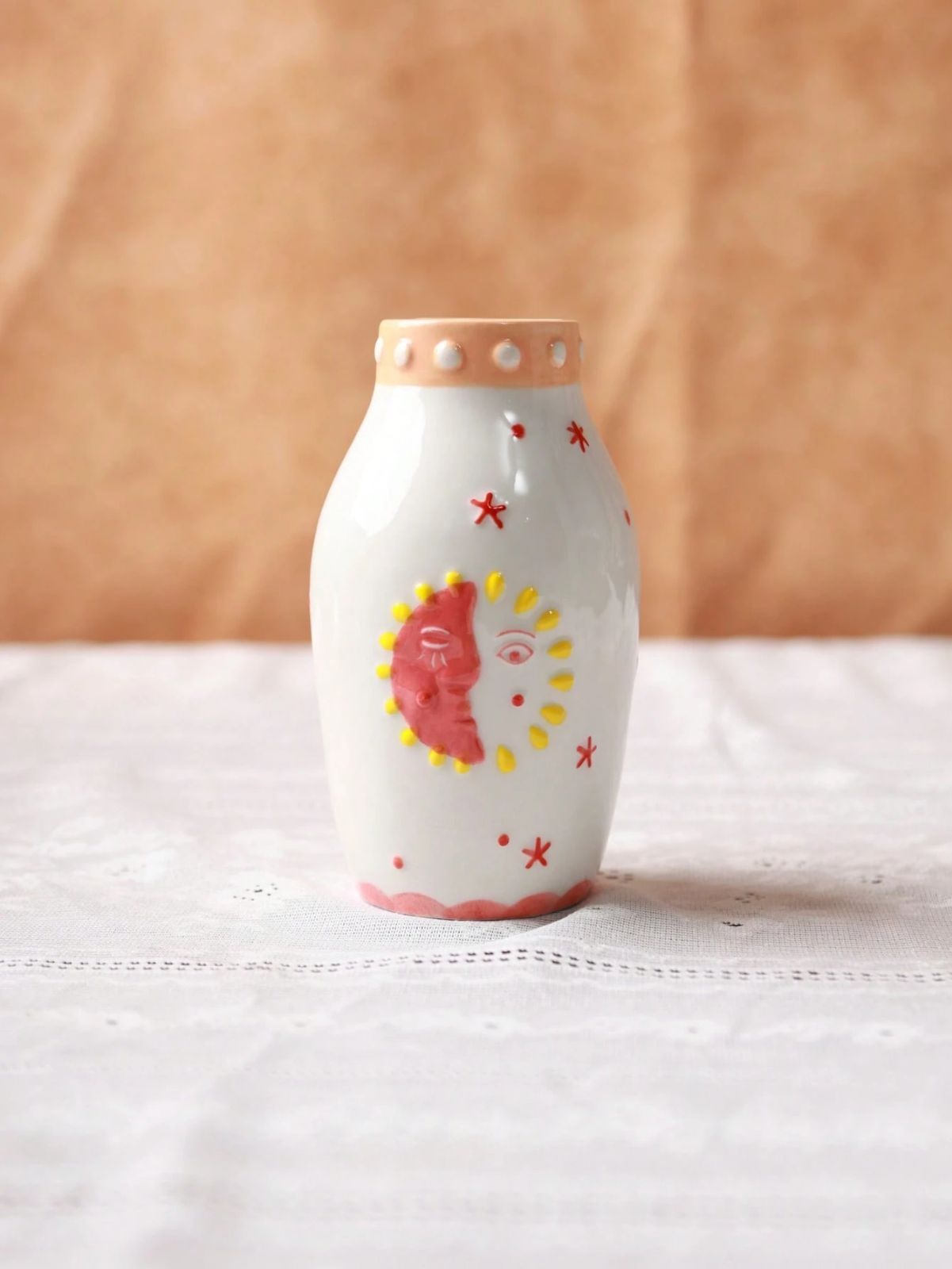 1個 ユニークなセラミックベース、かわいいボヘミアンデコレーション、ドライフラワーや一輪挿しに最適なクリームカラーのベース - 太陽と月の顔デザイン