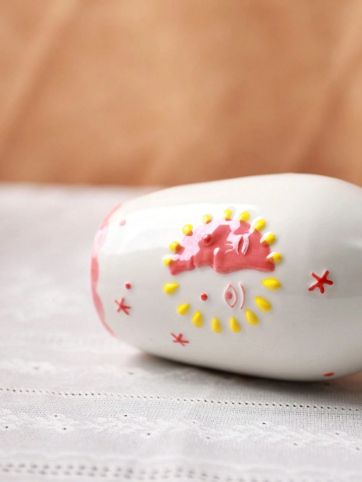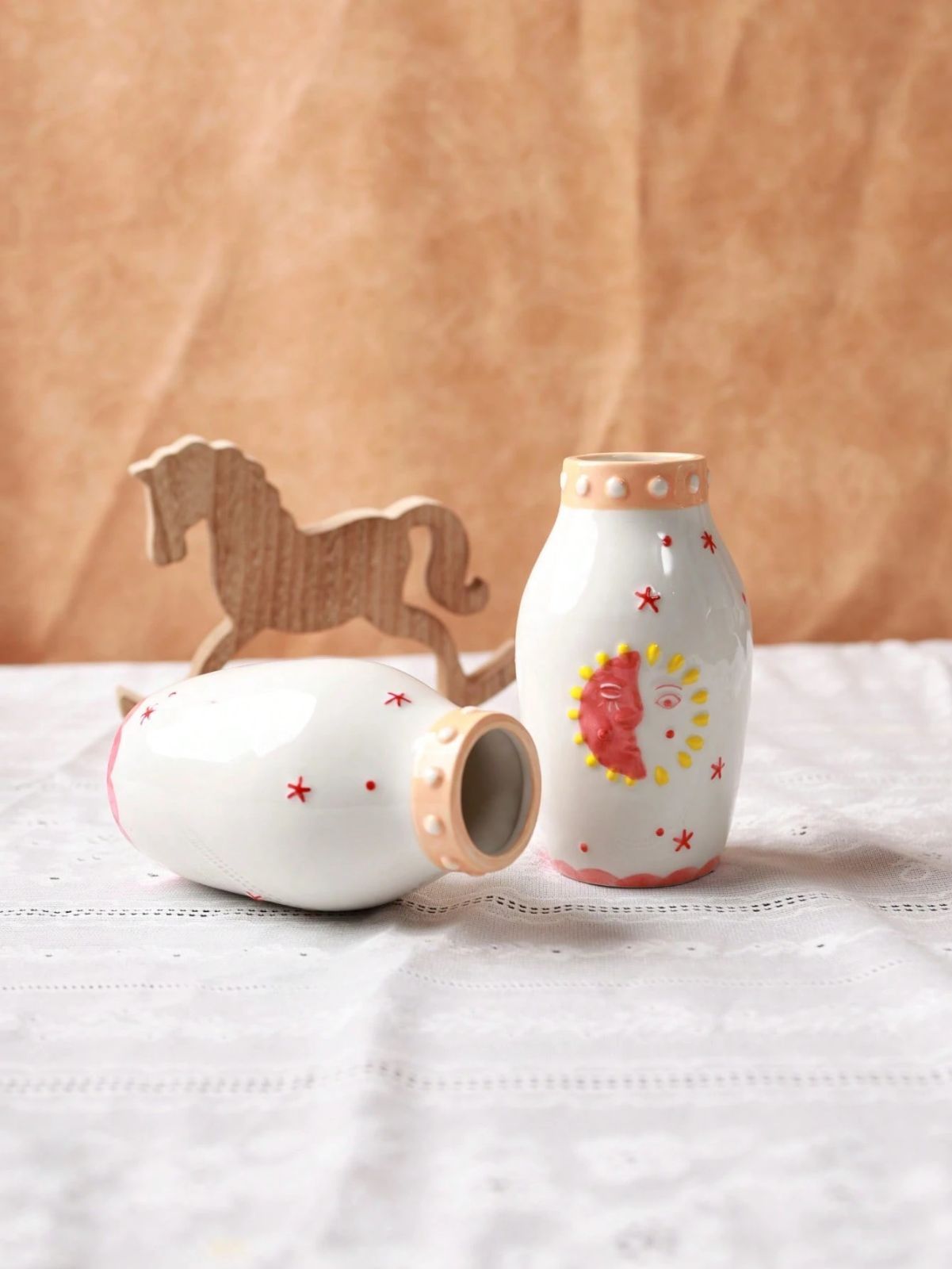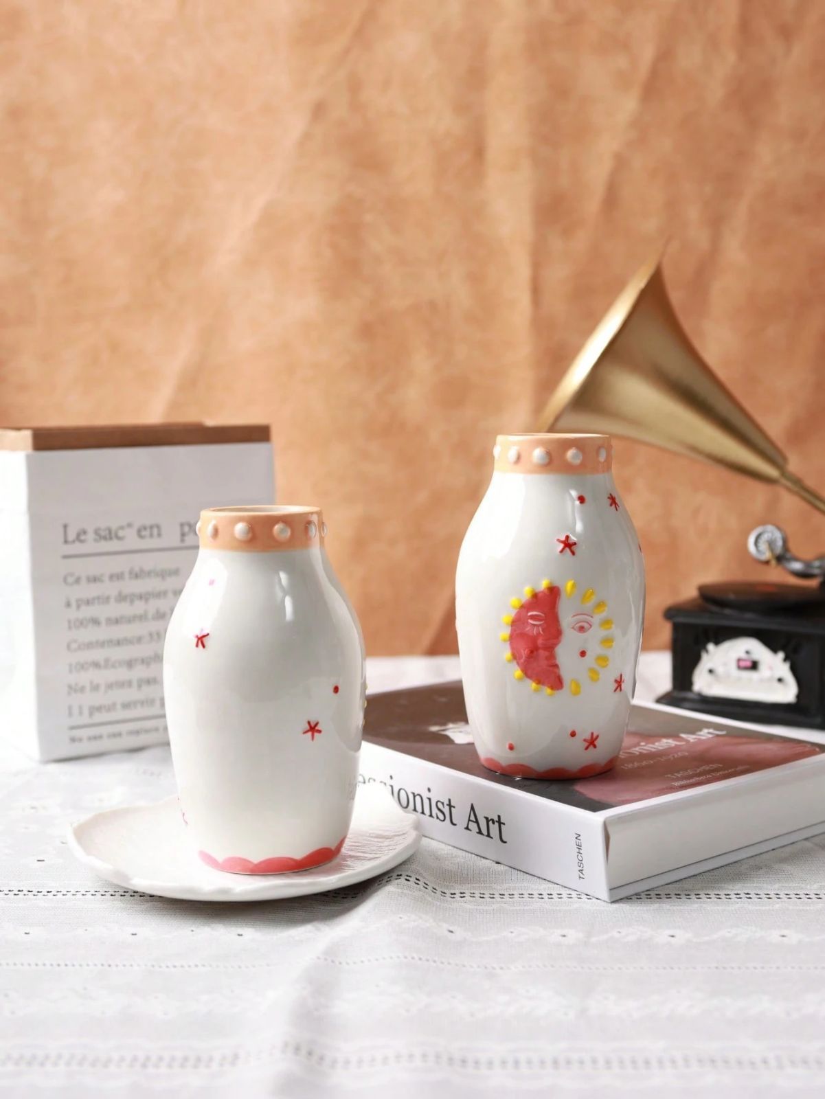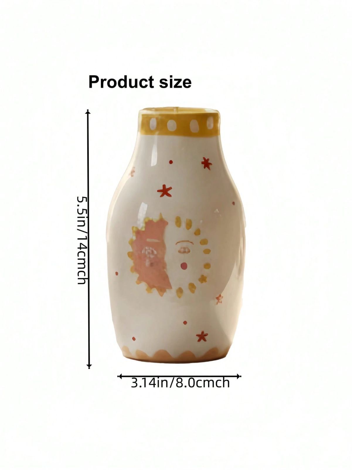 1個 ユニークなセラミックベース、かわいいボヘミアンデコレーション、ドライフラワーや一輪挿しに最適なクリームカラーのベース - 太陽と月の顔デザイン