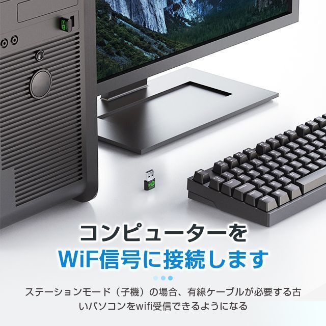 ・【1台2役&親機、子機両用】本無線LAN子機は親機、子機どちらとしても使えます。ステーションモード(子機)の場合、有線ケーブルが必要する古いパソコンをwifi受信できるようになる。APモード(親機)の場合、スマートフォン、タブレット、ノートPCなどにwi-fiを提供できます。ただ、親機として使用する場合、無線LANがアクセスする設備にネットワーク登録する必要があります。