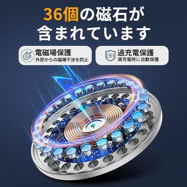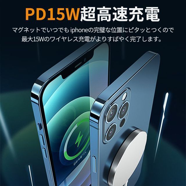 【マグネット式ワイヤレス充電器】For Magケース対応の最新技術に適用するため、磁力強いのマグネット1輪を内蔵し、iPhone12やiPhone13全シリーズでは位置合わせの手間をかけず、背面に磁石でバッと吸着します、振り回しても位置ずれする心配がありません。マグネット式無接触充電器なので、他のQi機種にも対応可能ですが、マグネットによる吸着はしません。