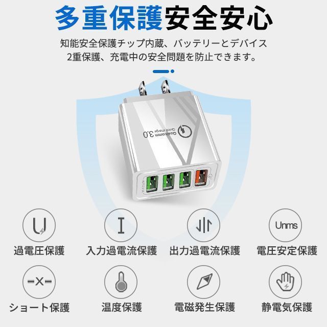 【耐用性】高品質な防火、燃焼を防止するPC材質を採用され、高温を耐える充電器です。耐用な加工材質を採用された外装および高品質な内部のチップにより、擦り傷や落下時の衝撃に強い耐久性能を実現しました。 長期間交換必要がなくて、AC100-240V入力、違う国にも使用できるコンセントです。