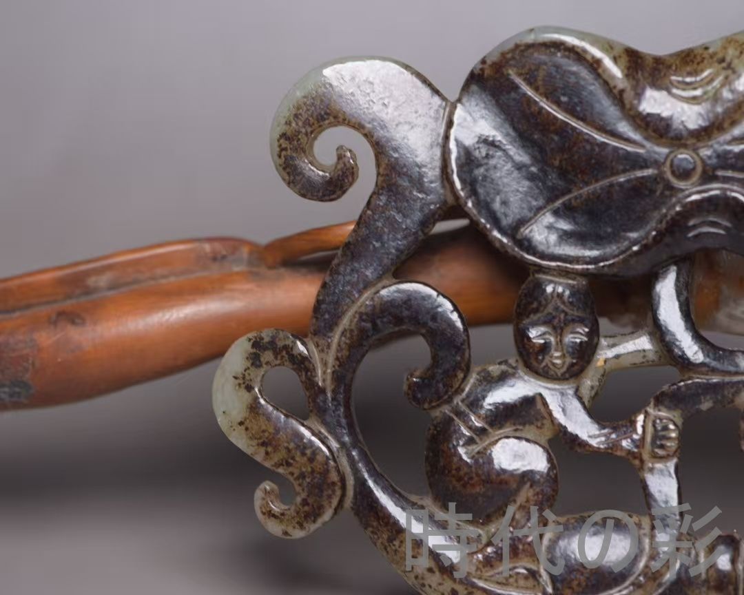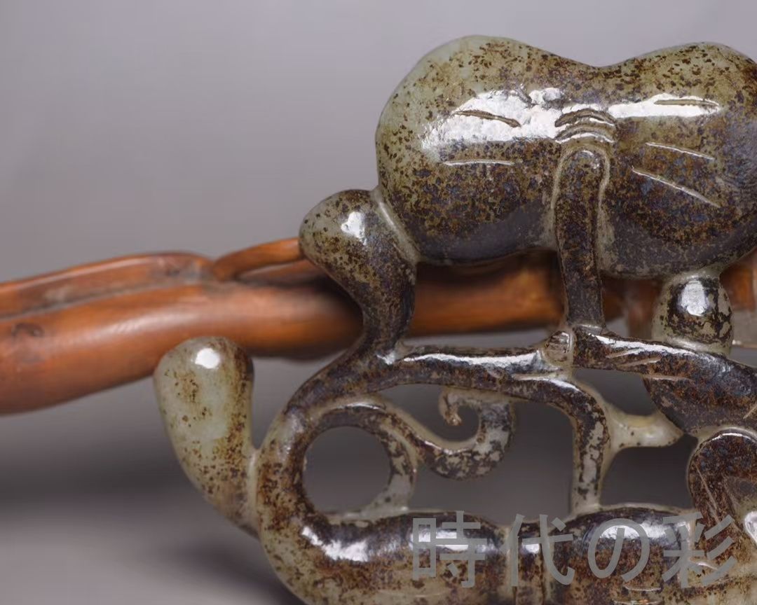 玉質温潤細?、沁色自然。童子形象は生動で慈愛に満ち、蓮花を携えた吉祥図。刀工は老道で線条流麗。皮殻包漿状態も一流の、收藏価値が高い古玉人物彫刻です。