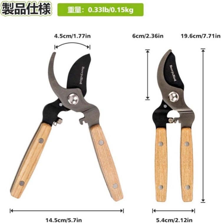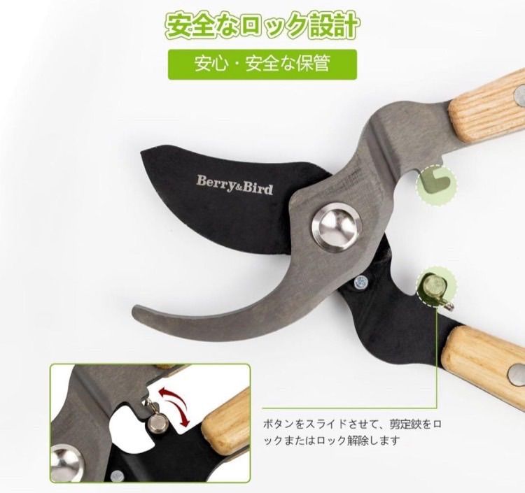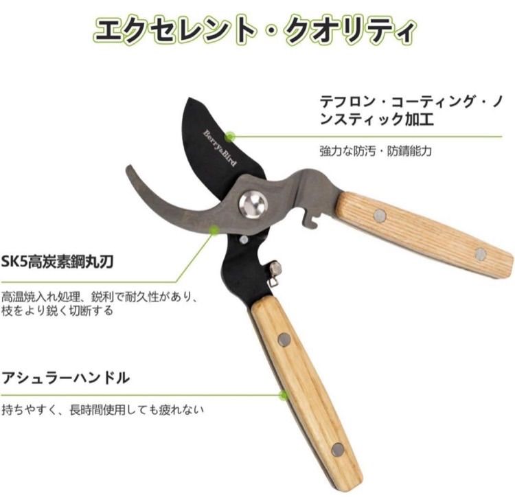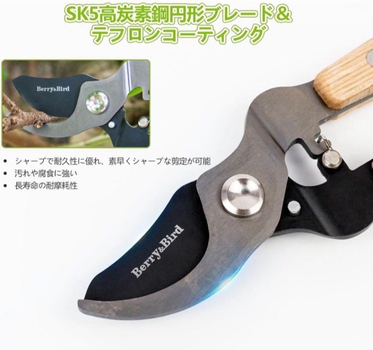Berry&Bird カーブ刃付き庭木えだきりばさみ、SK5高炭素鋼ブレード、テフロンコーティング、汚れと錆に強い、長い寿命、人間工学に基づいたアッシュ材のハンドルと安全ラッチ付き剪定はさみ、花木・盆栽剪定用の園芸用手動式はさみ