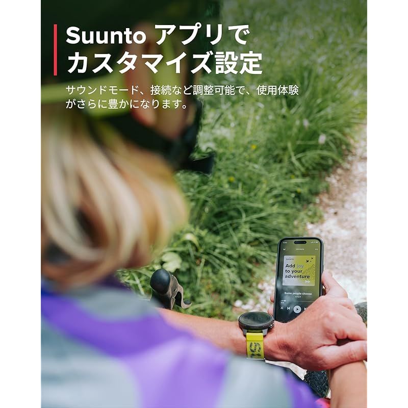 【アプリでカスタマイズ設定】 SUUNTOアプリと接続すれば、バッテリー残量の確認やサウンドモード(通常モード/アウトドアモード)の切替、デュアルデバイス接続の設定も簡単に行えます。さらに、最新のSUUNTOウォッチとペアリングすることで、トレーニング中のラップタイムや平均速度などの音声フィードバックも受けられるようになります