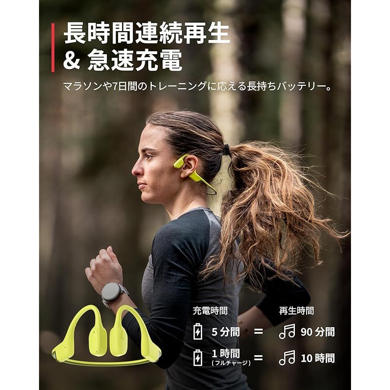 【10時間再生 & 急速充電】 大容量バッテリーを搭載し、最大10時間の連続再生可能(マラソン約2回分に相当)。急速充電にも対応しており、5分の充電で90分間の再生が可能。さらに、バッテリー残量0%から100%充電までわずか1時間以内で完了します