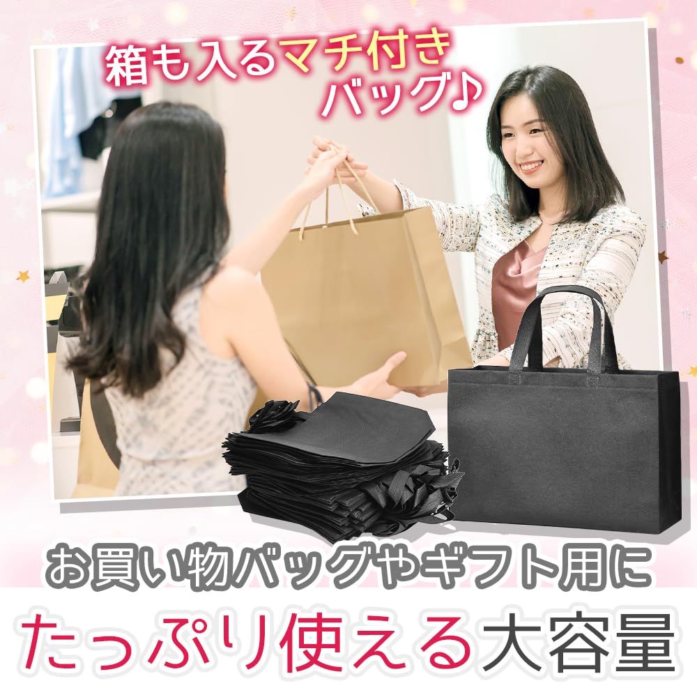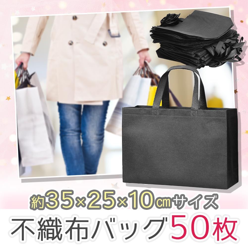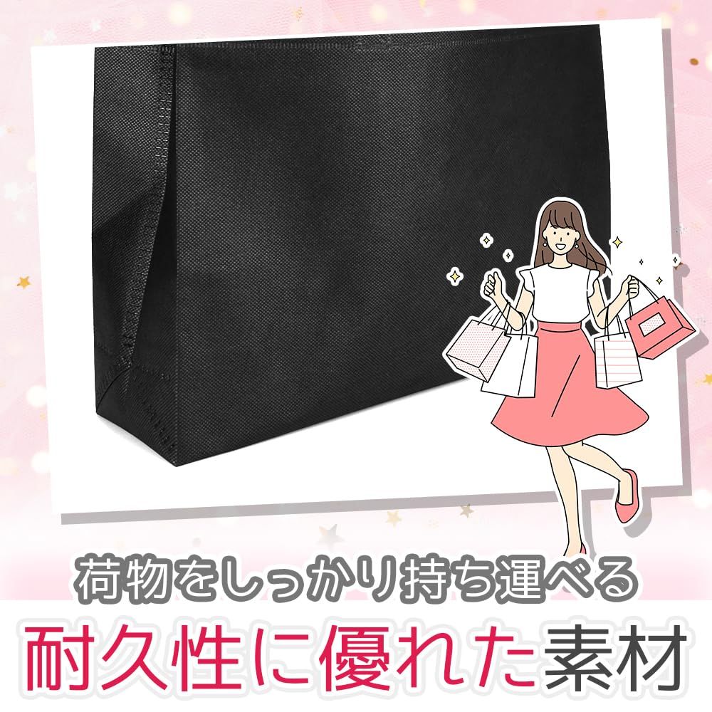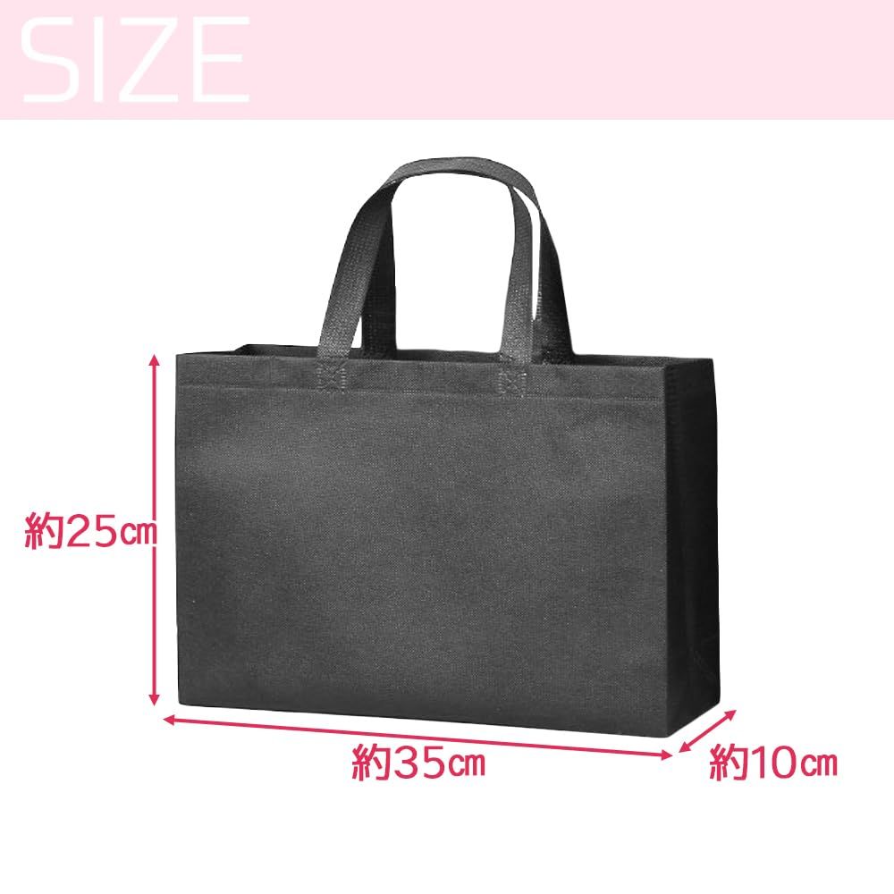 外出先で急に荷物が増えても楽々持ち運べる手提げバッグです。未使用時は薄く折り畳めるため、いざという時にバッグに備えていても邪魔になりません。A4サイズがゆったり入るサイズ感でご用意致しました。 本体は防水性と耐久性に優れた不織布を採用しており、何度使ってもへたりにくいところがポイント。底にはマチがあるので、お弁当箱・水筒・上着・書籍といった厚みのあるアイテムにもお使いいただけます。イラストや柄が描かれていないシンプルなデザインのため、企業説明会・入学式・卒業式・学園祭など様々なシーンで使用可能です。ショップの福袋やエコバッグにも使える利便性の高い手提げバッグは、業務用としても重宝する大容量の50枚セットでお届け致します。【セット内容】手提げバッグ×50点 【サイズ(約)】35cm×25cm×10cm 【カラー】ブラック 【材質】不織布※本製品は《"T&K-24"》のオリジナル商品となります。包装や製品の仕様変更等を行う事がある為、他出品者様の出品はご遠慮ください。【T&K-24】以外からの購入は仕様が異なる場合がございます。