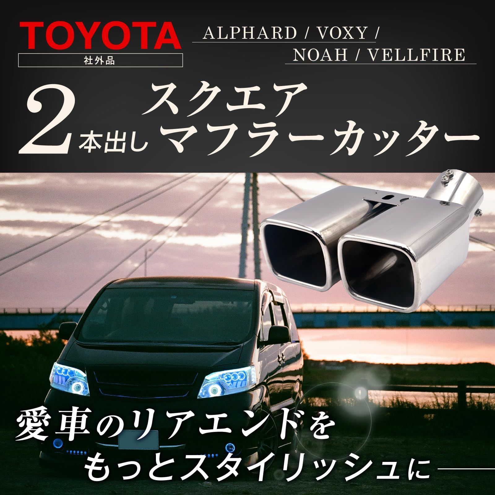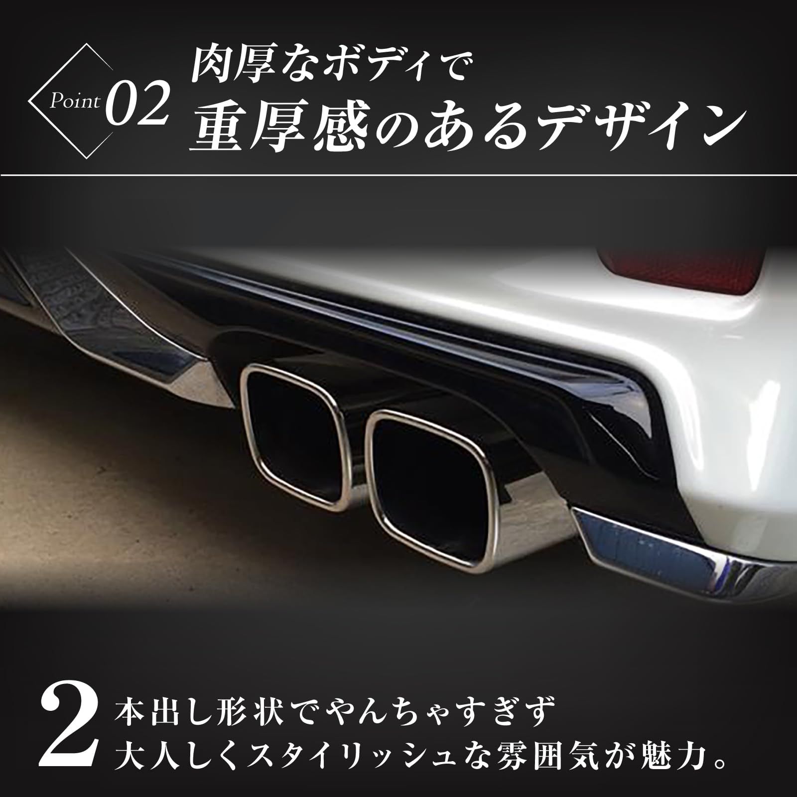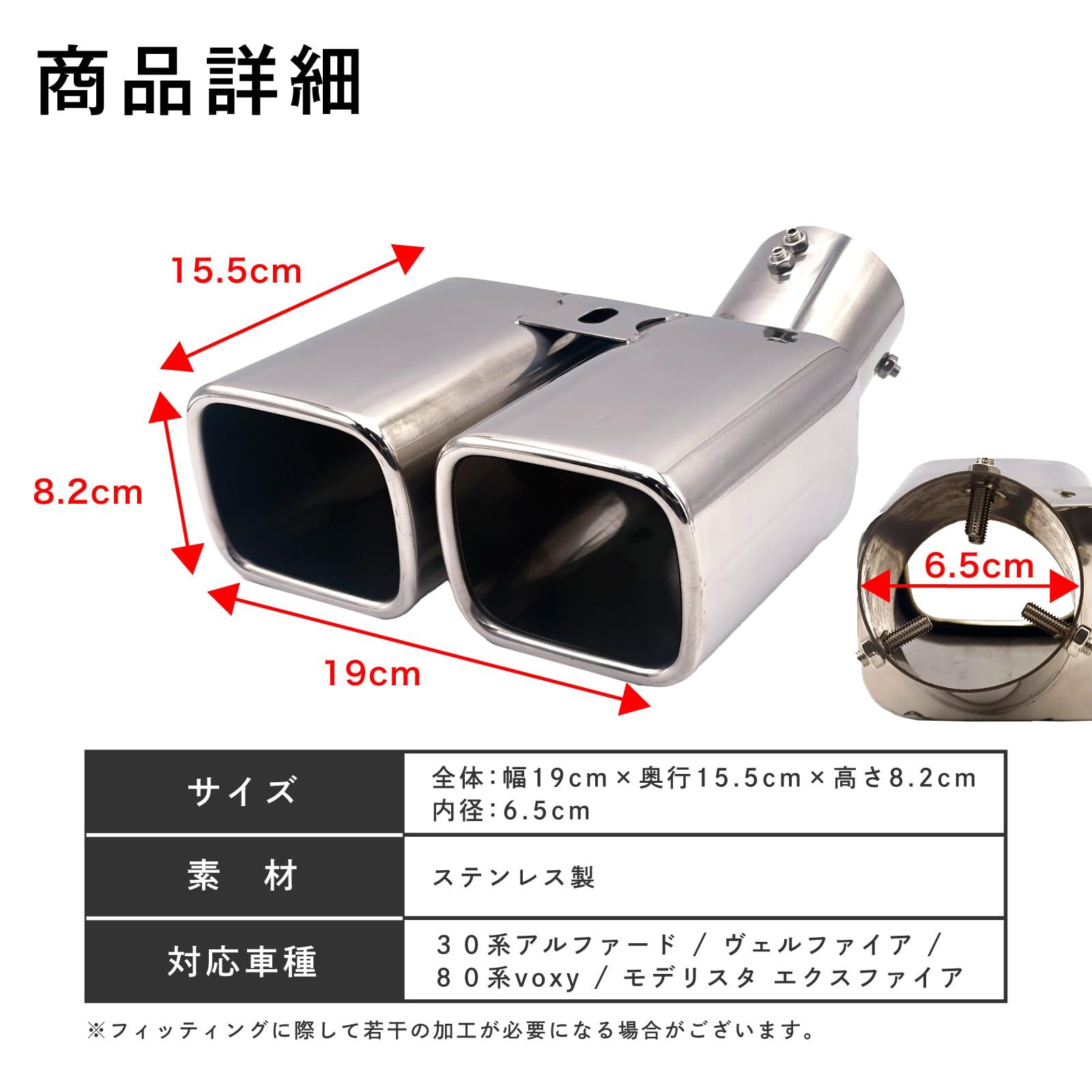 Dorisの社外品マフラーカッターは、アルファードおよびヴェルファイア(30系)の車種専用設計ですが、VOXY(ヴォクシー)80系やモデリスタにもマッチ致します。また、ハリアー60系、オデッセイRB1、エスティマ50系、エルグランドE52など、他の車種にもお客様にて加工頂くことで、取付られた事例もあり汎用性もあります。ただし、これらの車種への取付を当店で保証するものではありませんので、取付をお試しになる場合はご注意ください。高品質なステンレス素材を使用し、リアビューを引き締めるスタイリッシュなデザインです。取り付けが難しい場合は専門店にご相談ください。