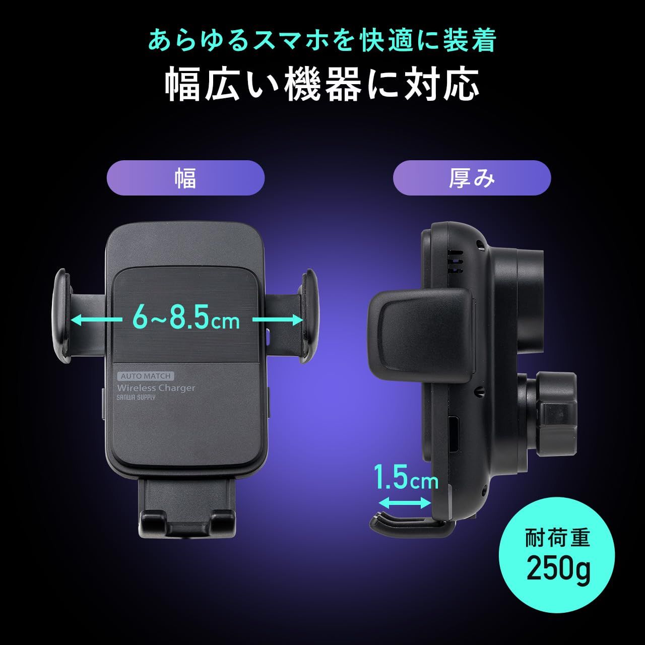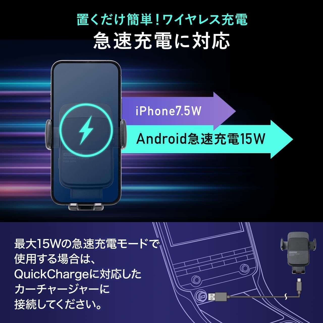 サンワダイレクト 車載ホルダー ワイヤレス充電 充電コイル自動検知 自動開閉 吸盤/ドリンクホルダー取付 最大15W 急速充電 スマホホルダー 車 充電 200-CAR101