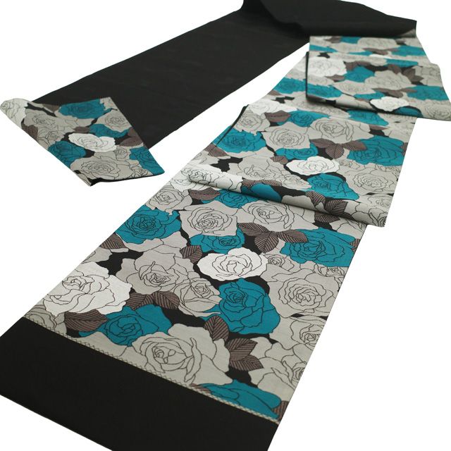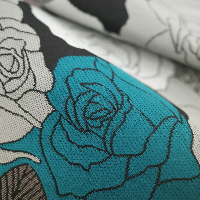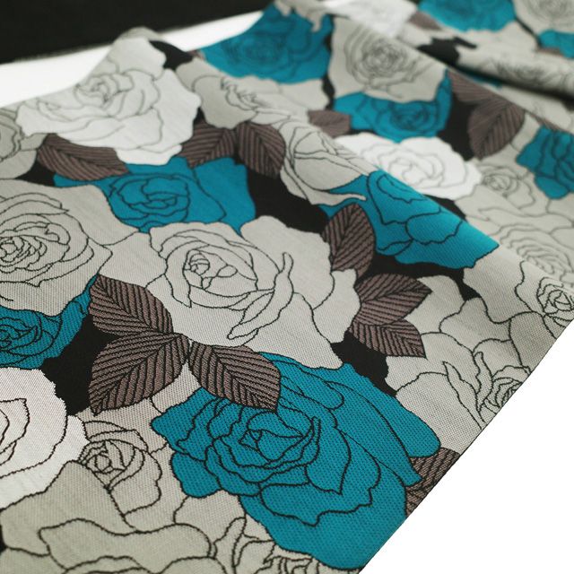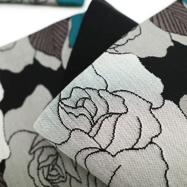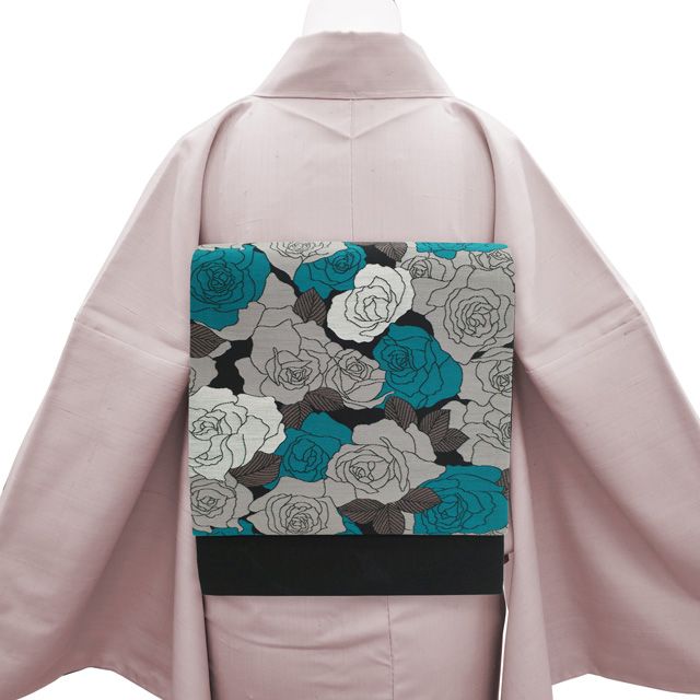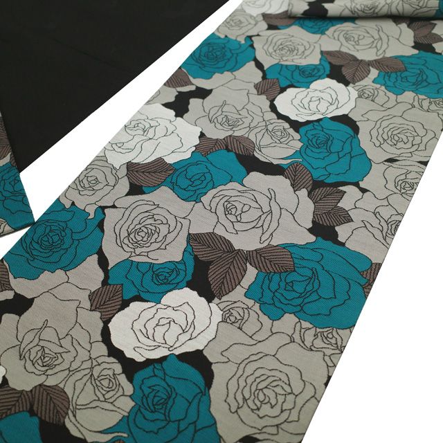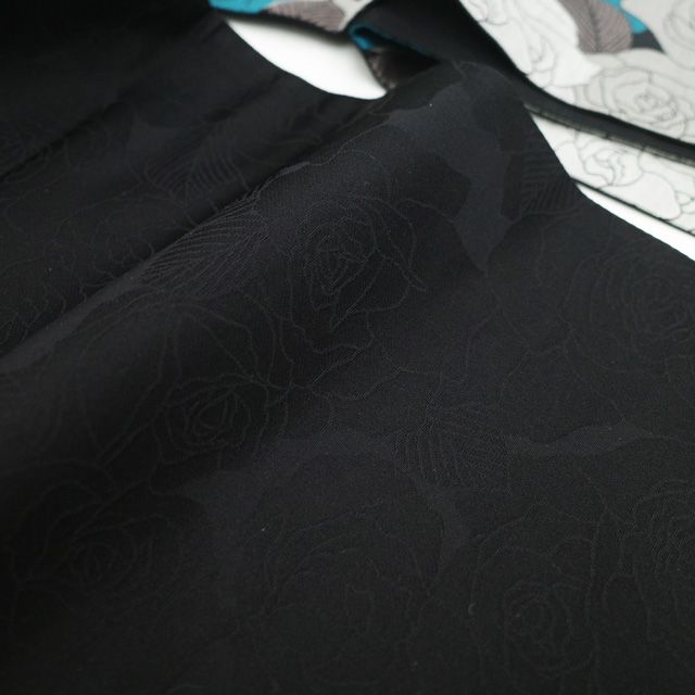粋な黒地に、ターコイズやグレーなどの落ち着いた色調でバラ文様が織り上げられたこちらのお品。