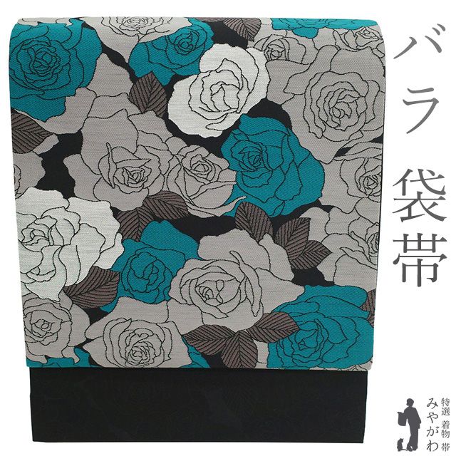 【中古】 袋帯 リサイクル 正絹 京都 西陣 黒地 ターコイズ グレー 薔薇 バラ 花 カジュアル ロングサイズ 長尺 おしゃれ 春 秋 冬 上質 袋帯 仕立て上がり みやがわ sb54905